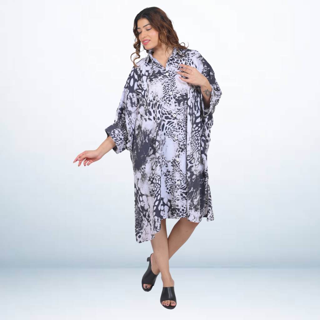 Unleash your wild side with our Animal Print Kaftan Shirt from the Kuberaa Fashions Boutique Exclusive Collection. This chic button-up short kaftan is a statement of bold elegance, featuring an eye-catching animal print crafted on lightweight polyester fabric.