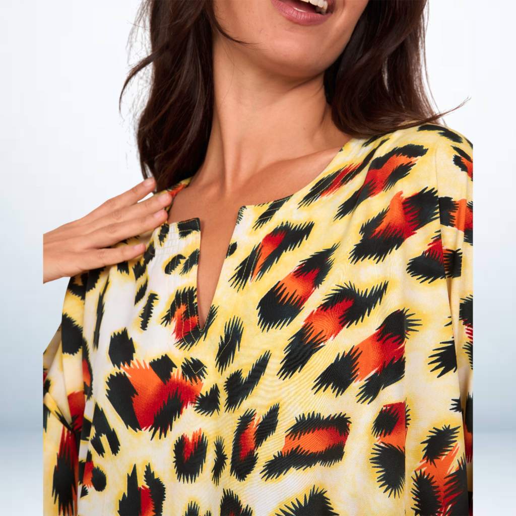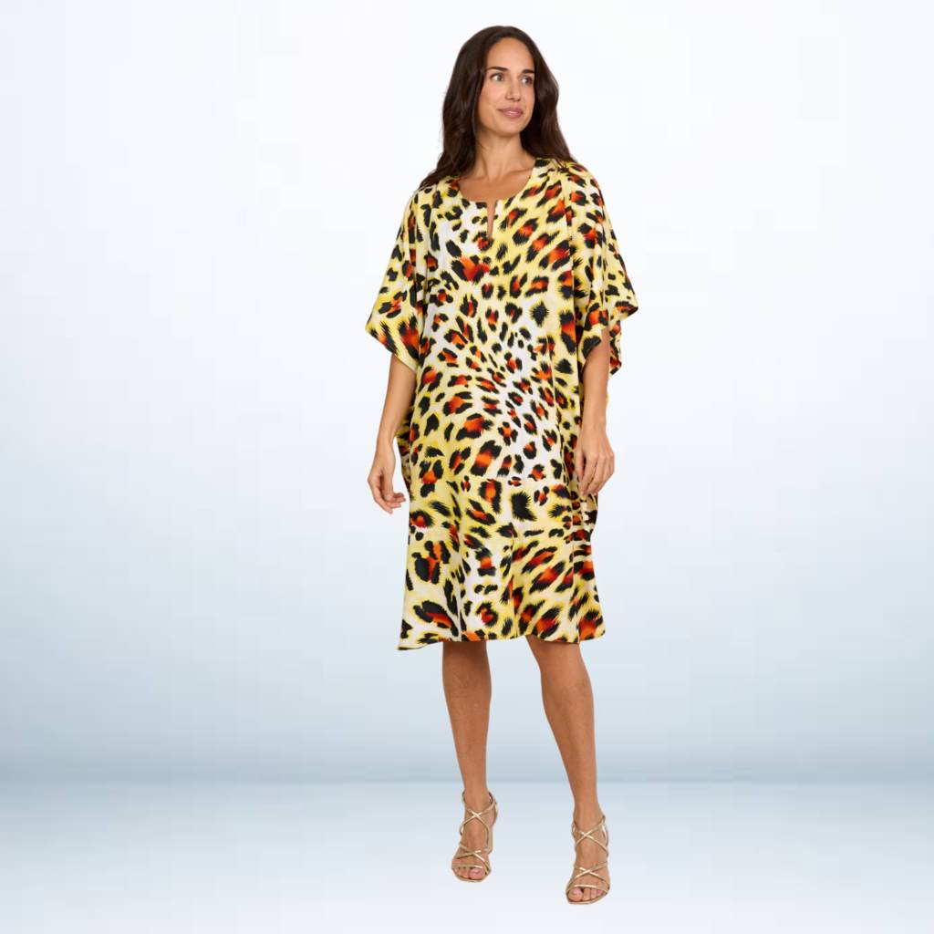 Turn heads with this animal print short kaftan dress, a bold blend of comfort and statement style. The eye-catching leopard-inspired pattern in warm yellow, orange, and black tones adds a fierce yet fashionable touch. Crafted from soft, breathable fabric, it drapes effortlessly to give you a relaxed and flattering fit. The loose silhouette and V-neckline make it ideal for casual days, vacations, or resort getaways — keeping you cool while looking chic.