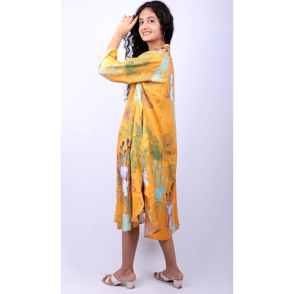 Elevate your everyday elegance with the Artisan Bloom Printed Dress from Kuberaa Fashions. Featuring a gallery-inspired floral sketch print on a radiant golden yellow base, this boutique-exclusive piece is crafted from soft polyester for a luxurious yet breathable feel. The full-length sleeves, collared neckline, and flowing silhouette blend comfort and sophistication, making it perfect for brunch dates, holiday strolls, or casual daywear. Designed in a free size for an easy fit, this dress pairs effortlessly with sandals or statement accessories to complete the look.