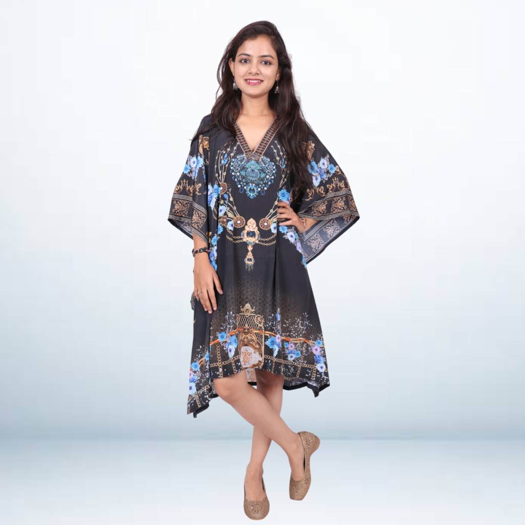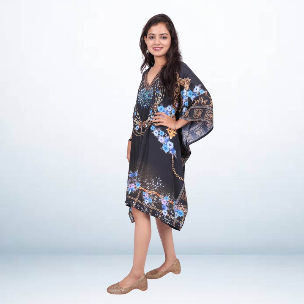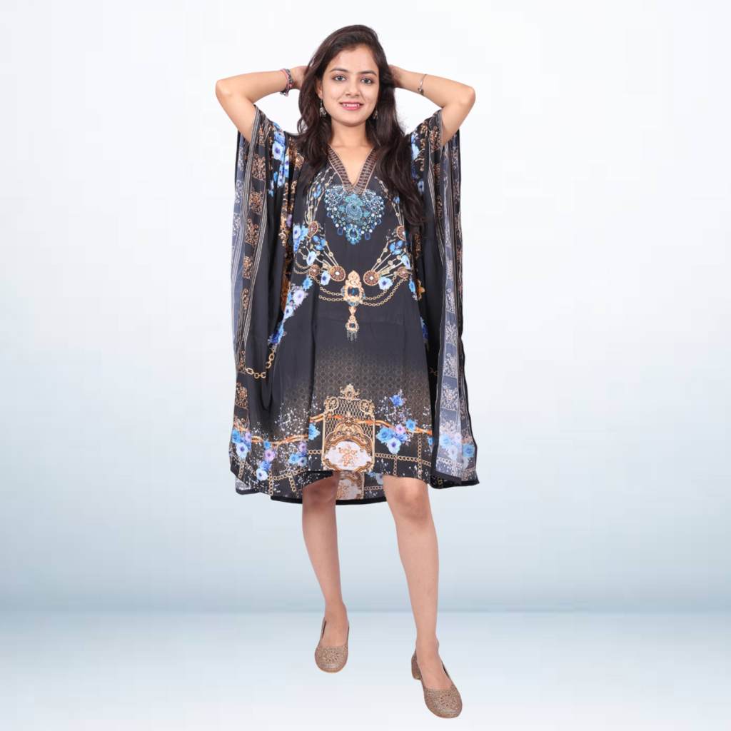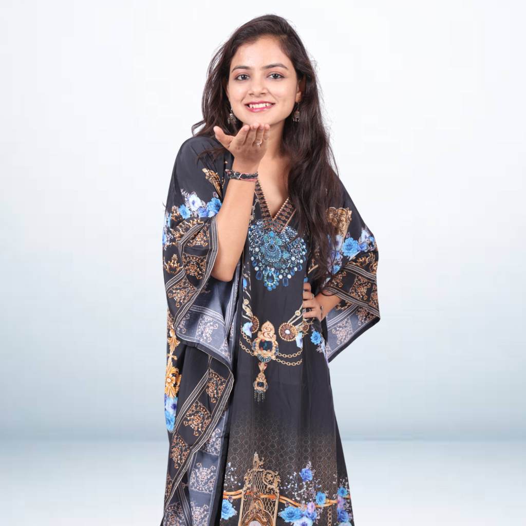 Add a pop of style to your wardrobe with this digital printed kaftan. Made from lightweight, breathable fabric, it features vibrant prints that stand out while keeping you comfortable all day. The relaxed fit and flowy design make it perfect for casual outings, vacations, or lounging. Pair it with jeans, leggings, or wear as a statement piece for an easy yet stylish look.