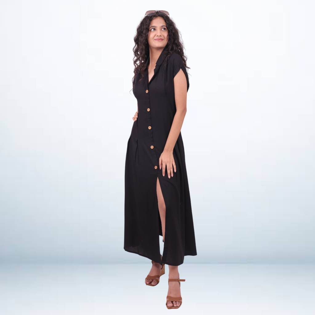 With its button-down front, smart shirt collar, and flattering slit design, this black dress exudes an effortless blend of modern edge and comfort. Whether you're stepping out for brunch, exploring on holiday, or simply relaxing in style—this dress brings a refined, confident charm to every moment.