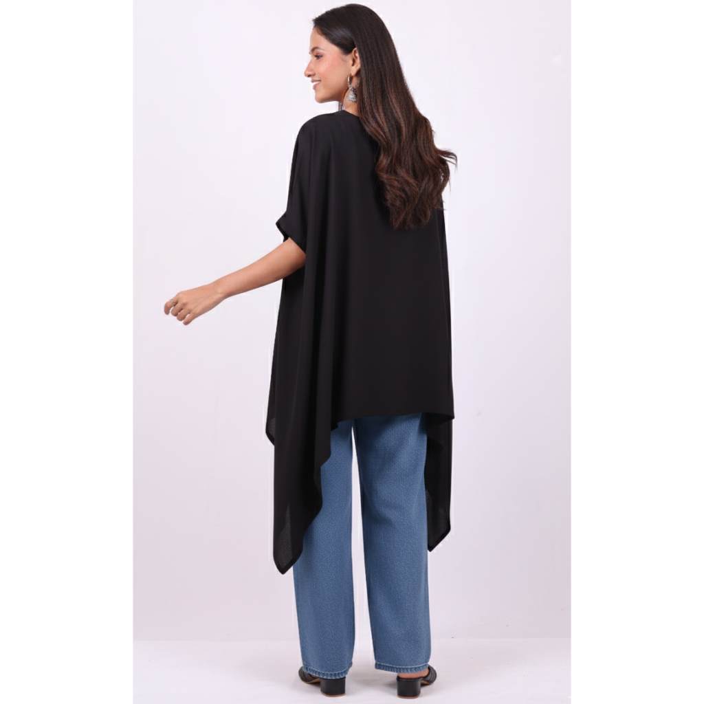 Elevate your casual wardrobe with this chic Black High-Low Poncho Shirt Top from Kuberaa Fashions. Designed with a flowy poncho silhouette, this top adds effortless elegance to any outfit. The front button detailing, relaxed sleeves, and dramatic high-low hemline give it a modern and stylish appeal. Perfect for pairing with jeans, pants, or leggings, this versatile top offers both comfort and sophistication.