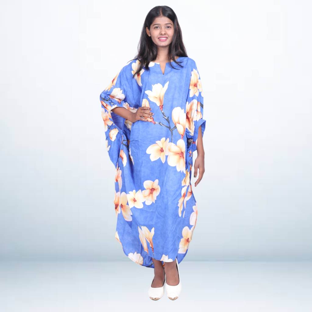 Step into effortless elegance with this beautiful blue floral printed long kaftan. Designed for comfort and grace, this free-size kaftan features a soothing blue base highlighted with large floral motifs in soft yellow and white. Perfect for lounging at home, casual outings, or resort vacations — this piece blends relaxation with refined style.