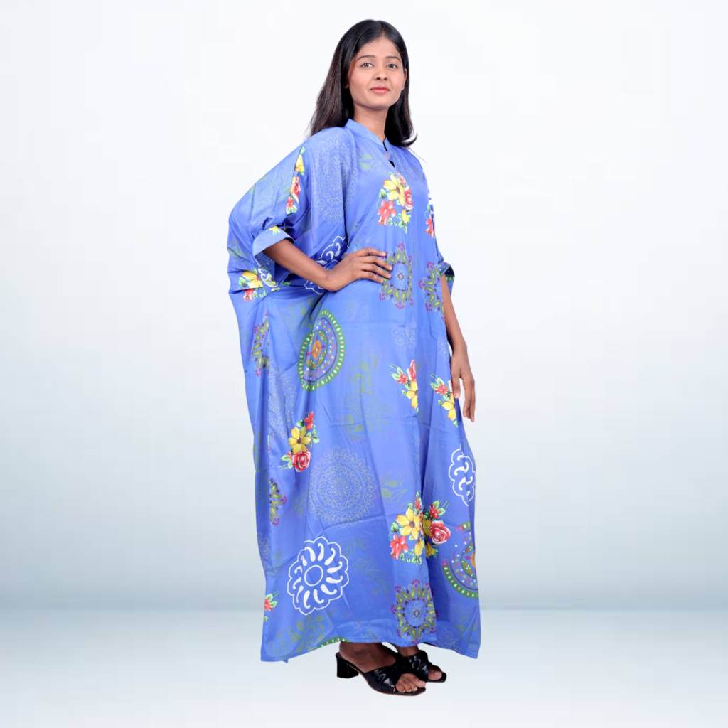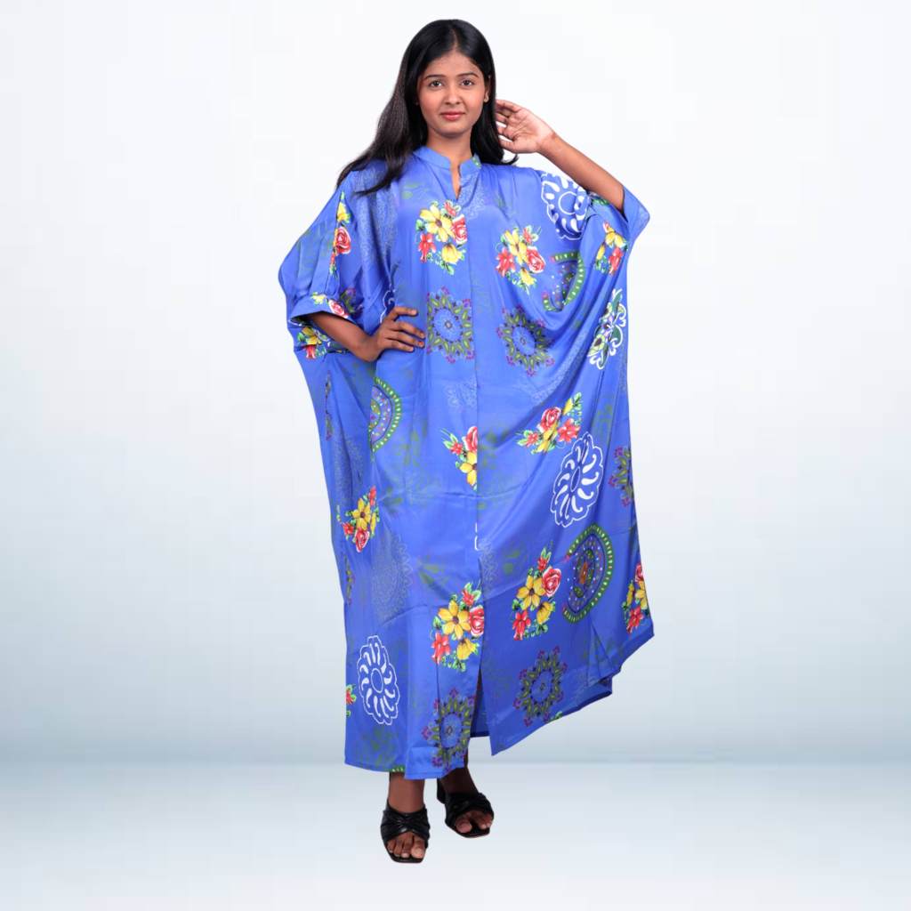 Bring effortless elegance to your everyday look with this blue floral printed long kaftan. Crafted from soft, breathable fabric, it features a vibrant floral and paisley print that adds a touch of charm and color. The relaxed free-size fit ensures ultimate comfort, while the front button-down design gives it a stylish, easy-to-wear look. Perfect for lounging, casual outings, or vacation wear.