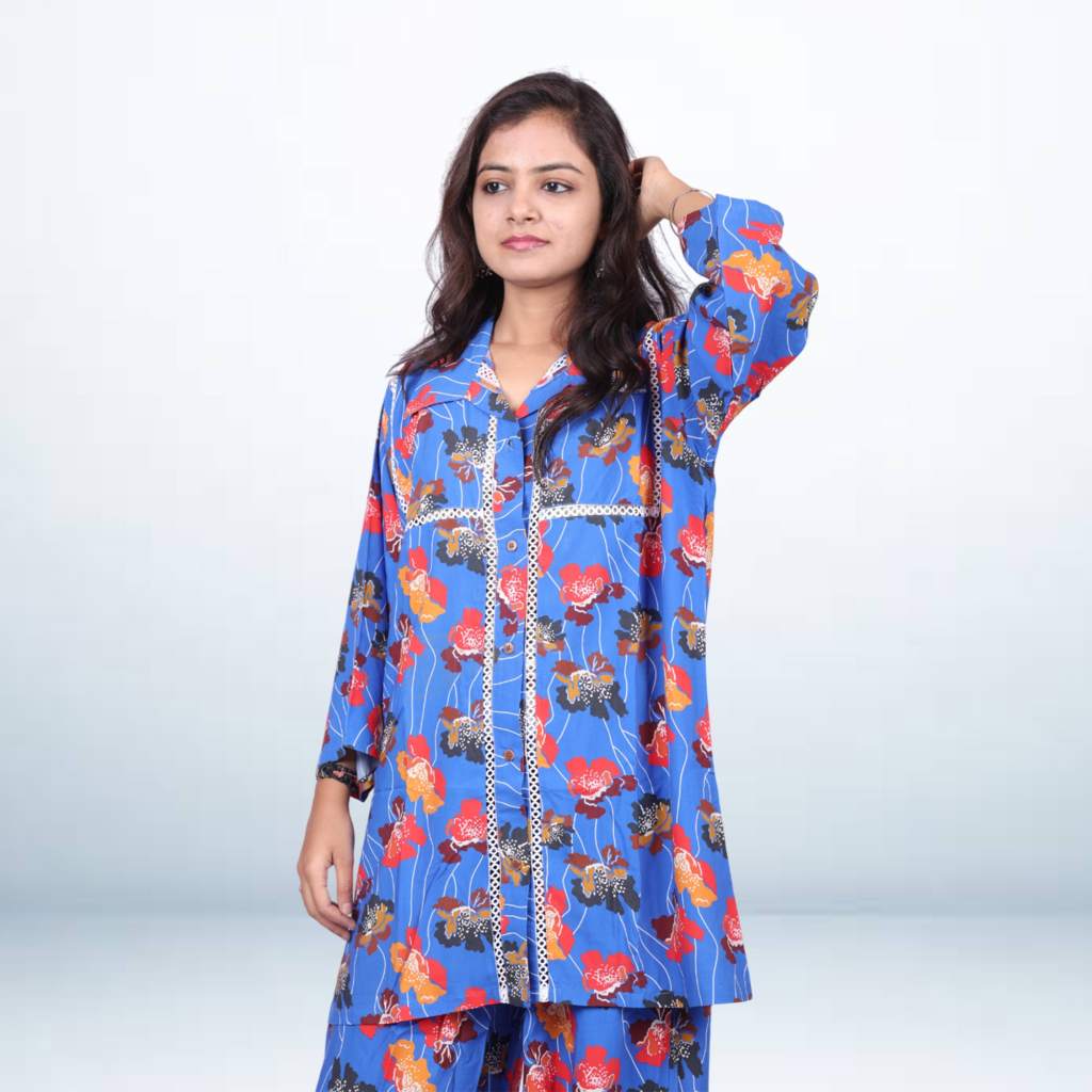 Brighten up your wardrobe with this Blue Printed Shirt Pant Set, crafted for comfort and style. The kaftan top features a collared neckline with button-down detailing, offering a modern twist to the classic design. Paired with relaxed-fit matching pants, the outfit ensures easy wear and effortless elegance. The bold floral-inspired print adds a lively touch, making it perfect for casual outings, lounge wear, or festive moments.