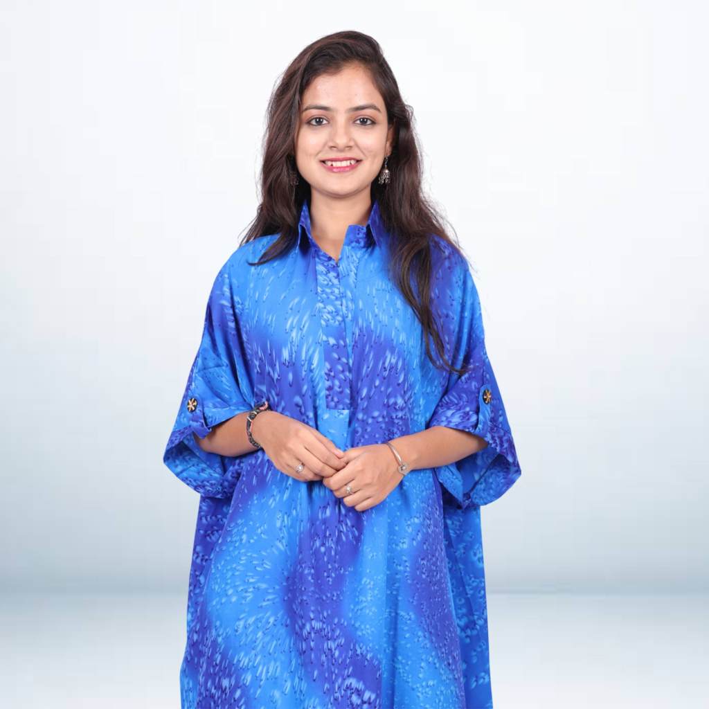Blue Hand Spray Printed Long Kaftan from the Kuberaa Fashions Boutique Exclusive Collection. Crafted from luxurious Soft fabric.