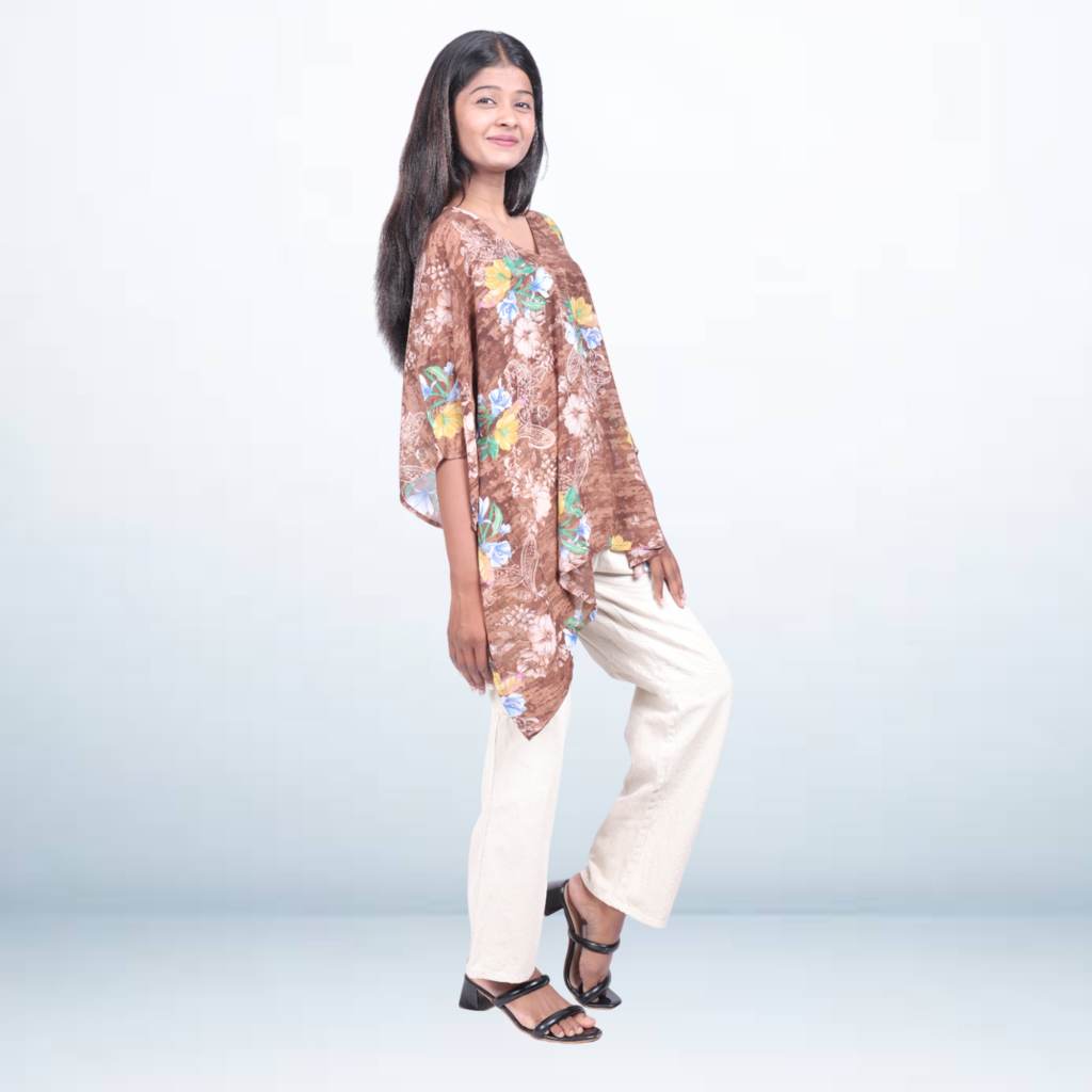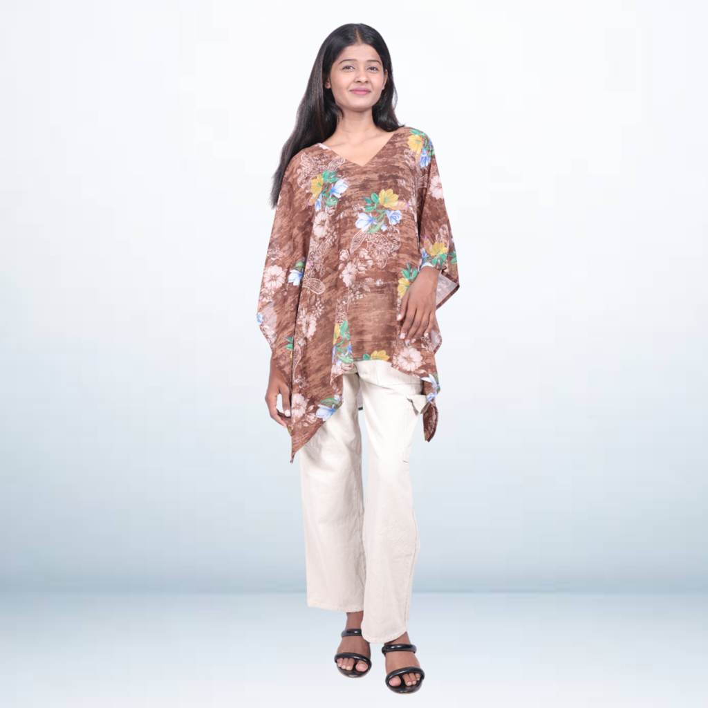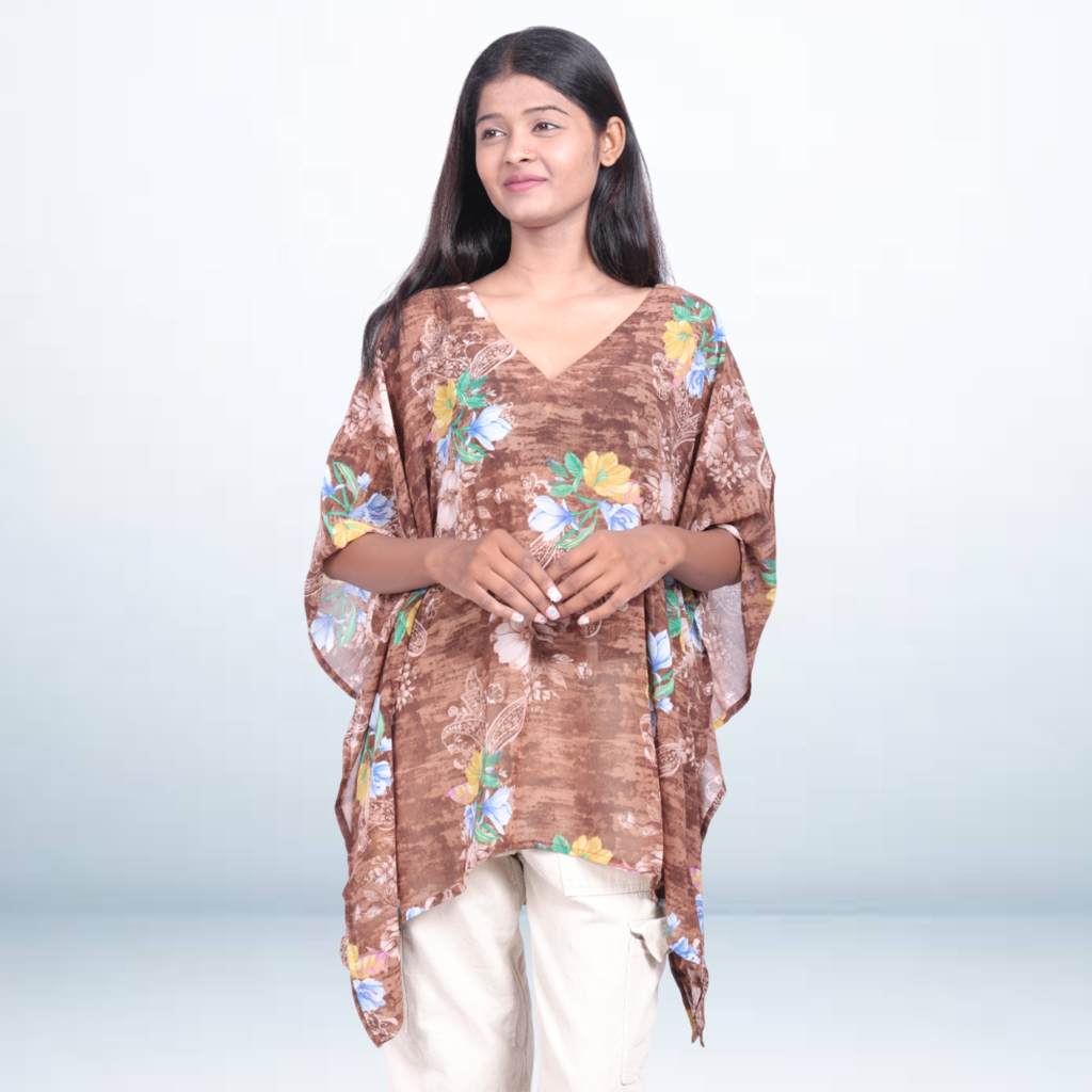 Add effortless charm to your look with this brown floral kaftan cover-up. Designed in soft, flowy fabric, it features vibrant floral motifs that lend a refreshing touch to the earthy brown base. The relaxed silhouette with a V-neckline and asymmetric hem offers both comfort and contemporary style. Perfect as a lightweight cover-up or casual tunic for any occasion.