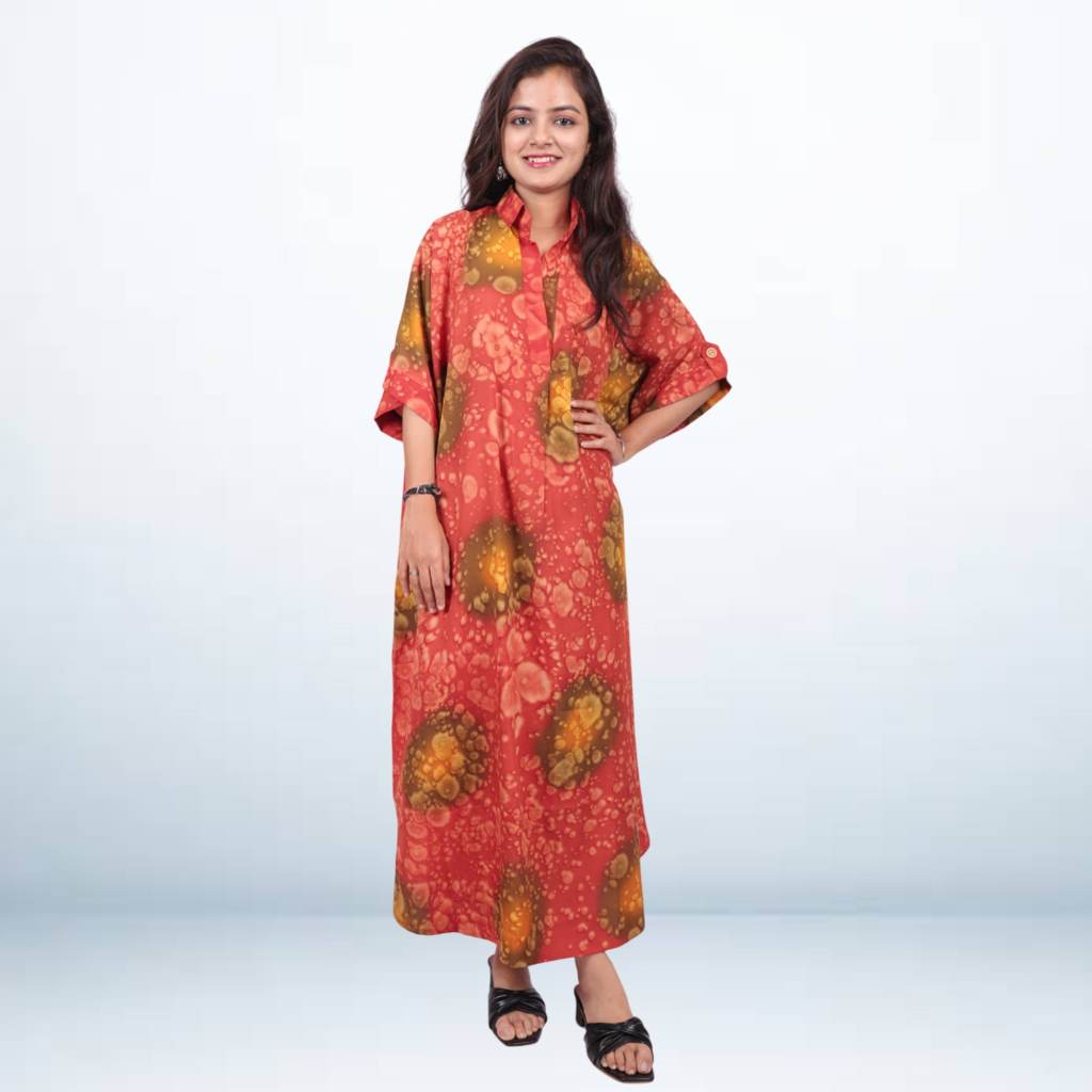Brown Hand Spray Printed Long Kaftan from the Kuberaa Fashions Boutique Exclusive Collection. Crafted from luxurious Soft fabric.