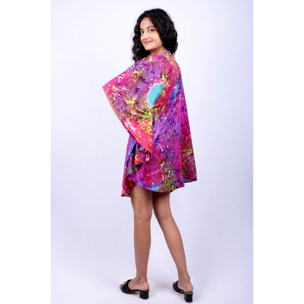 Turn heads in our Cosmic Burst Tie-Dye Kaftan Tunic, a vibrant masterpiece from the Kuberaa Fashions boutique exclusive collection. Made from soft, breathable polyester fabric, this short kaftan features a stunning multicolor cosmic burst print that mimics the brilliance of a galaxy. Designed with a flattering V-neckline and flowy kimono sleeves, it drapes beautifully on all body types and fits sizes M to 5XL effortlessly. Style it with your favorite bottoms—pants, leggings, or shorts—for a relaxed yet bold statement look.