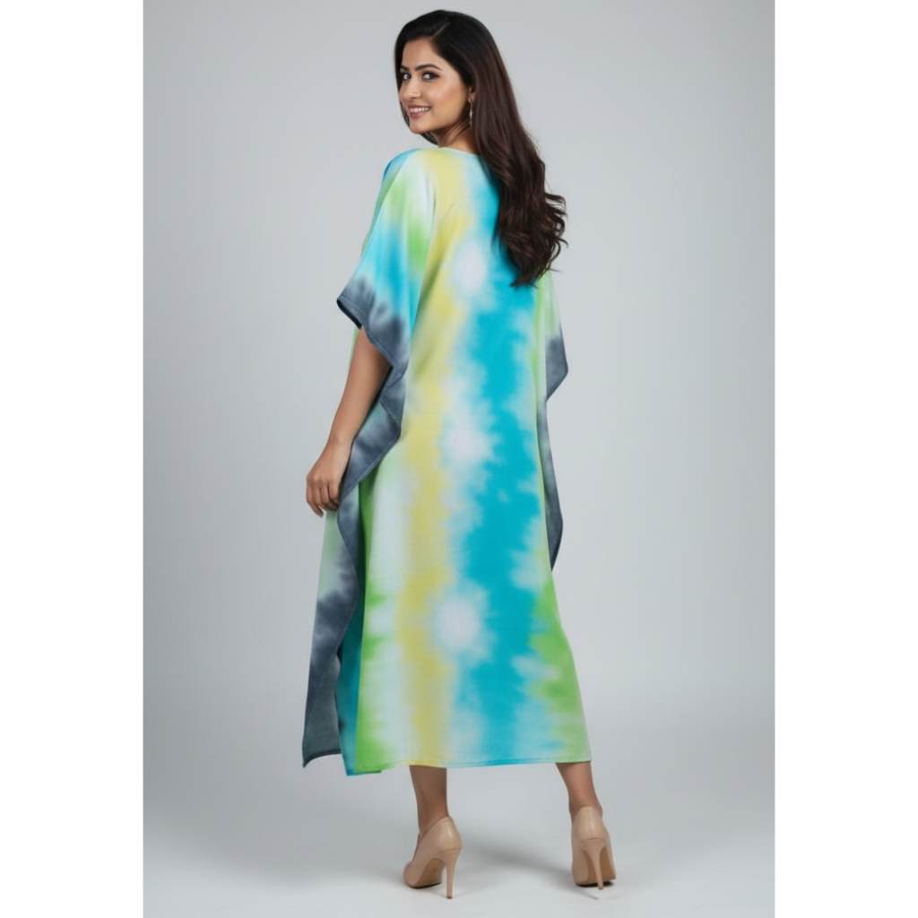 Experience effortless comfort with this refreshing Cotton Tie-Dye Long Kaftan, designed for women who love relaxed, breathable, and stylish everyday wear. Made from 100% soft cotton, this kaftan features a beautiful blend of aqua blue, lime green, white, and charcoal tie-dye shades — giving it a vibrant yet soothing look.