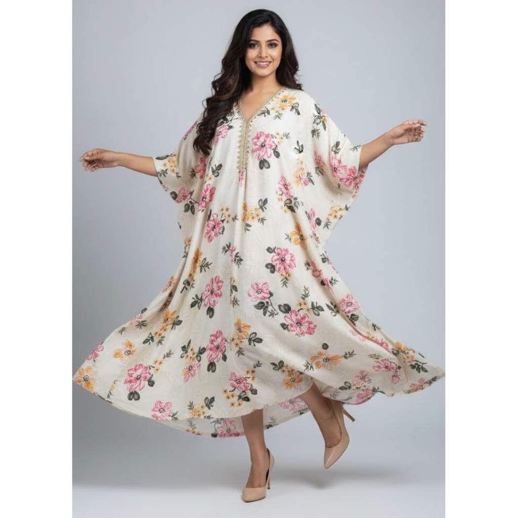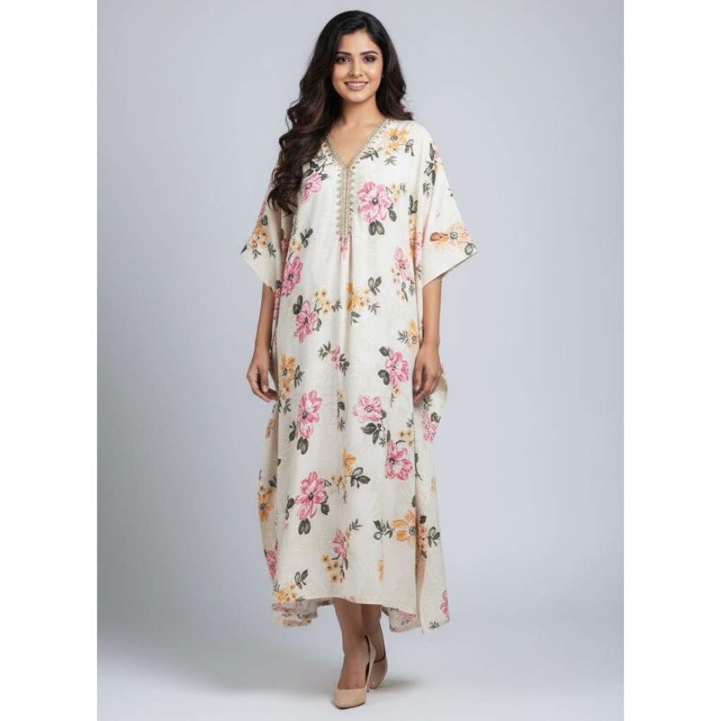 Step into timeless elegance with this Cream Floral Embroidered Kaftan Long Dress from Kuberaa Fashions. Featuring soft pastel floral prints and delicate embroidery along the neckline, this kaftan combines comfort with effortless sophistication. Made from breathable, flowy fabric, it drapes beautifully on all body types, making it the perfect choice for casual days, brunch gatherings, or resort vacations.