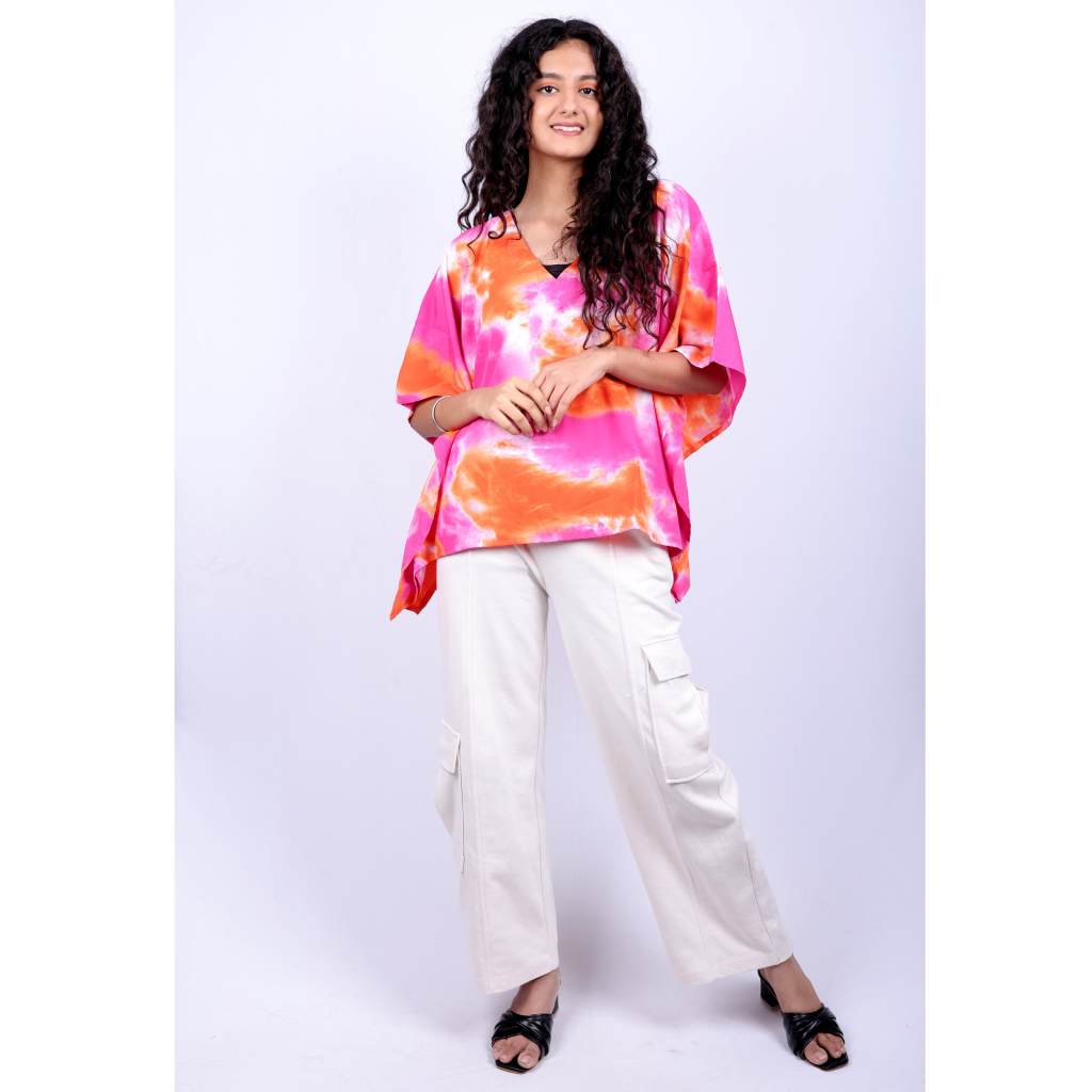Brighten up your wardrobe with the Crumple Tie Dye Kaftan Tunic in a stunning orange and pink ombre shade—exclusively from Kuberaa Fashions. Crafted in soft, breathable polyester, this boutique-exclusive kaftan fuses comfort with artistic flair through its crumple-style tie-dye design that evokes a vibrant, handcrafted look.
