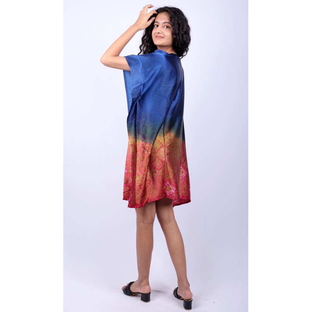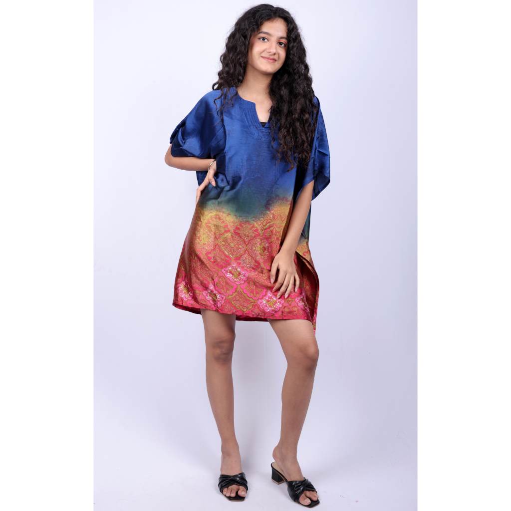 Elevate your wardrobe with the Damask Ethnic Print Kaftan Tunic from Kuberaa Fashions’ boutique exclusive collection. Crafted from lightweight polyester, this free-size kaftan features an eye-catching ombre gradient from royal blue to warm gold, finished with a rich damask and floral ethnic print at the hem. The V-neckline and kimono-style sleeves offer a relaxed silhouette, perfect for both day and evening wear.
