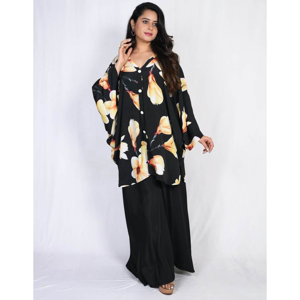 COORDINATED SET: Includes a matching wide-leg palazzo in solid black that perfectly complements the printed kaftan tunic