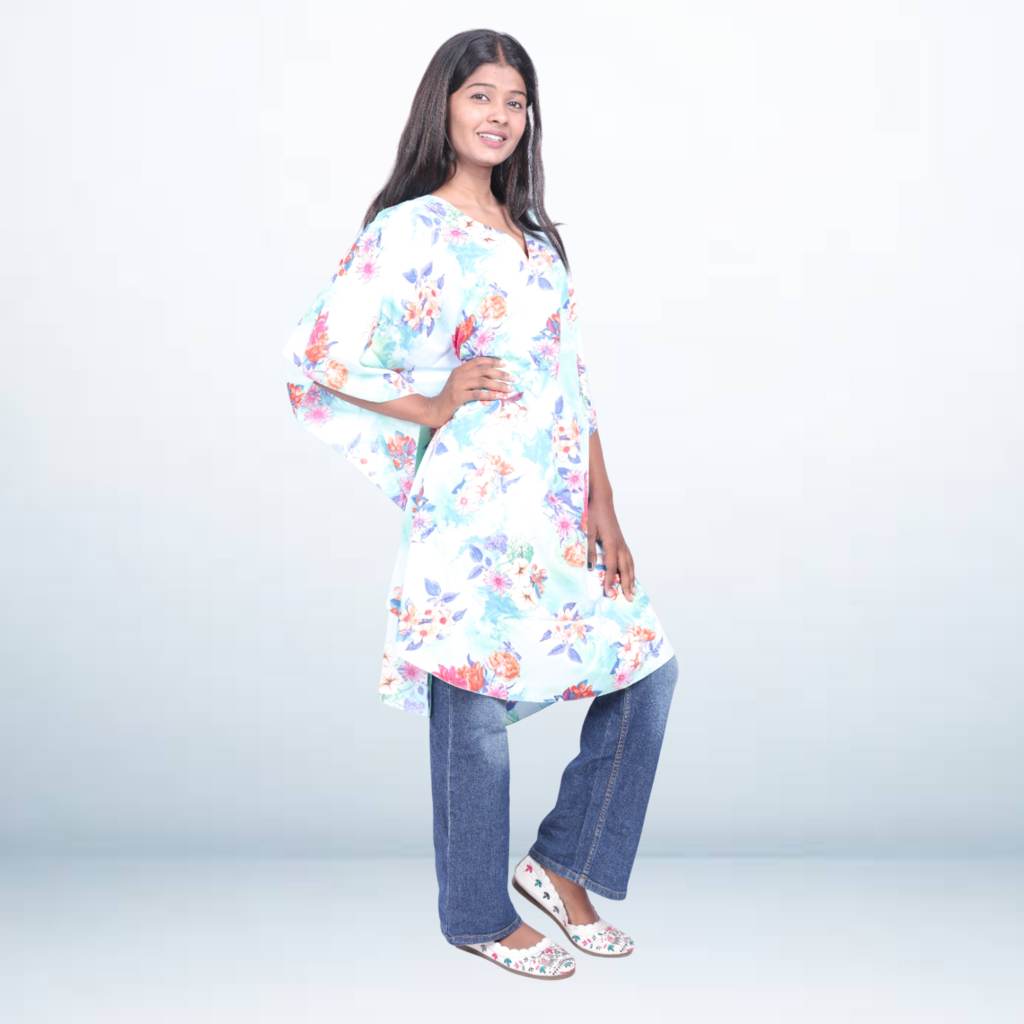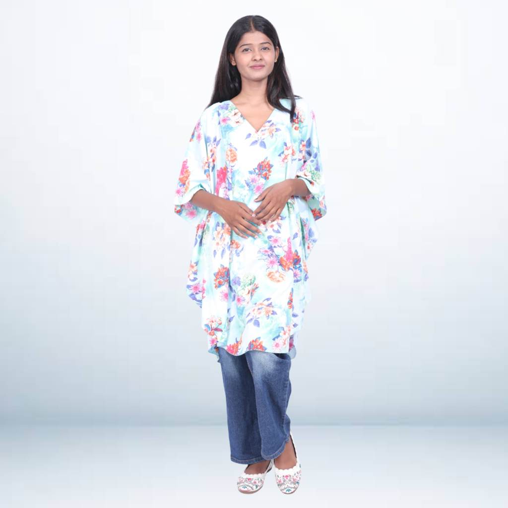 Add a refreshing touch to your wardrobe with this floral print light blue short kaftan tunic, designed with soft hues and a breezy silhouette. Crafted from lightweight, flowy fabric, this free-size kaftan ensures all-day comfort and effortless charm. The V-neckline and wide sleeves enhance its relaxed fit, making it perfect for casual days or resort outings.