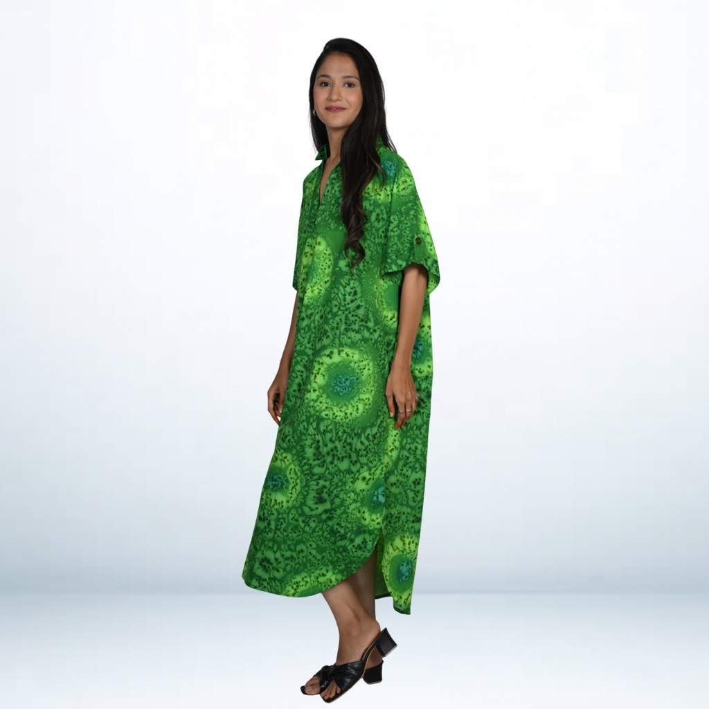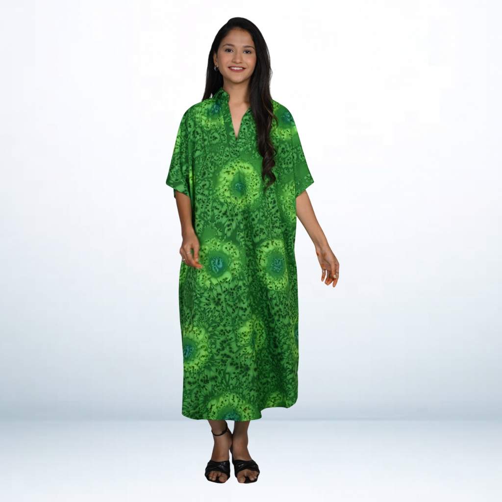 Green Hand Spray Printed Long Kaftan from the Kuberaa Fashions Boutique Exclusive Collection. Crafted from luxurious Soft fabric.