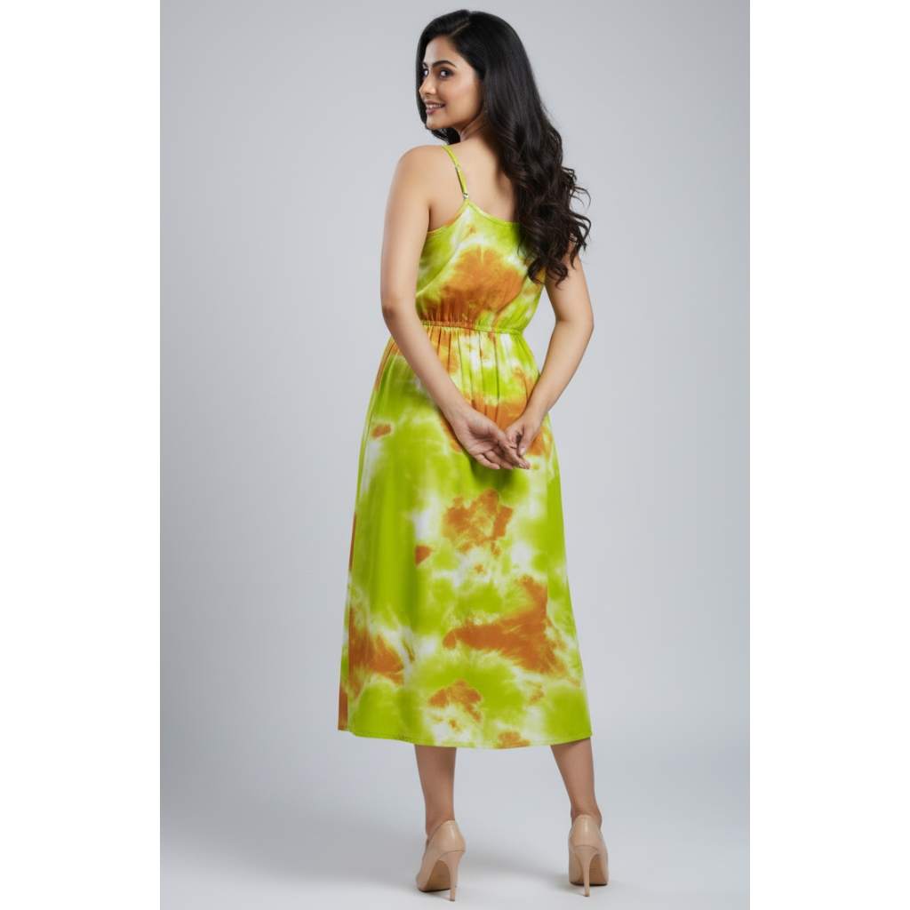 Bright, refreshing, and full of summer charm — this Green & Orange Tie-Dye Sleeveless Midi Dress from Kuberaa Fashions is designed for effortless everyday style. Featuring a vibrant hand-tie-dye inspired pattern, a comfortable elasticated waist, and delicate shoulder straps, this dress is perfect for warm weather and outdoor occasions. The soft fabric drapes beautifully, ensuring a breezy, relaxed fit.