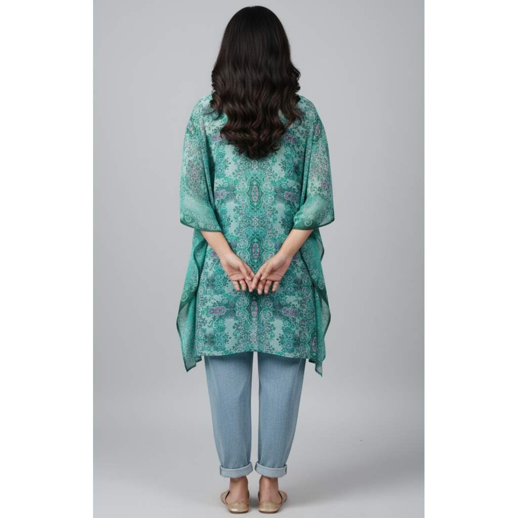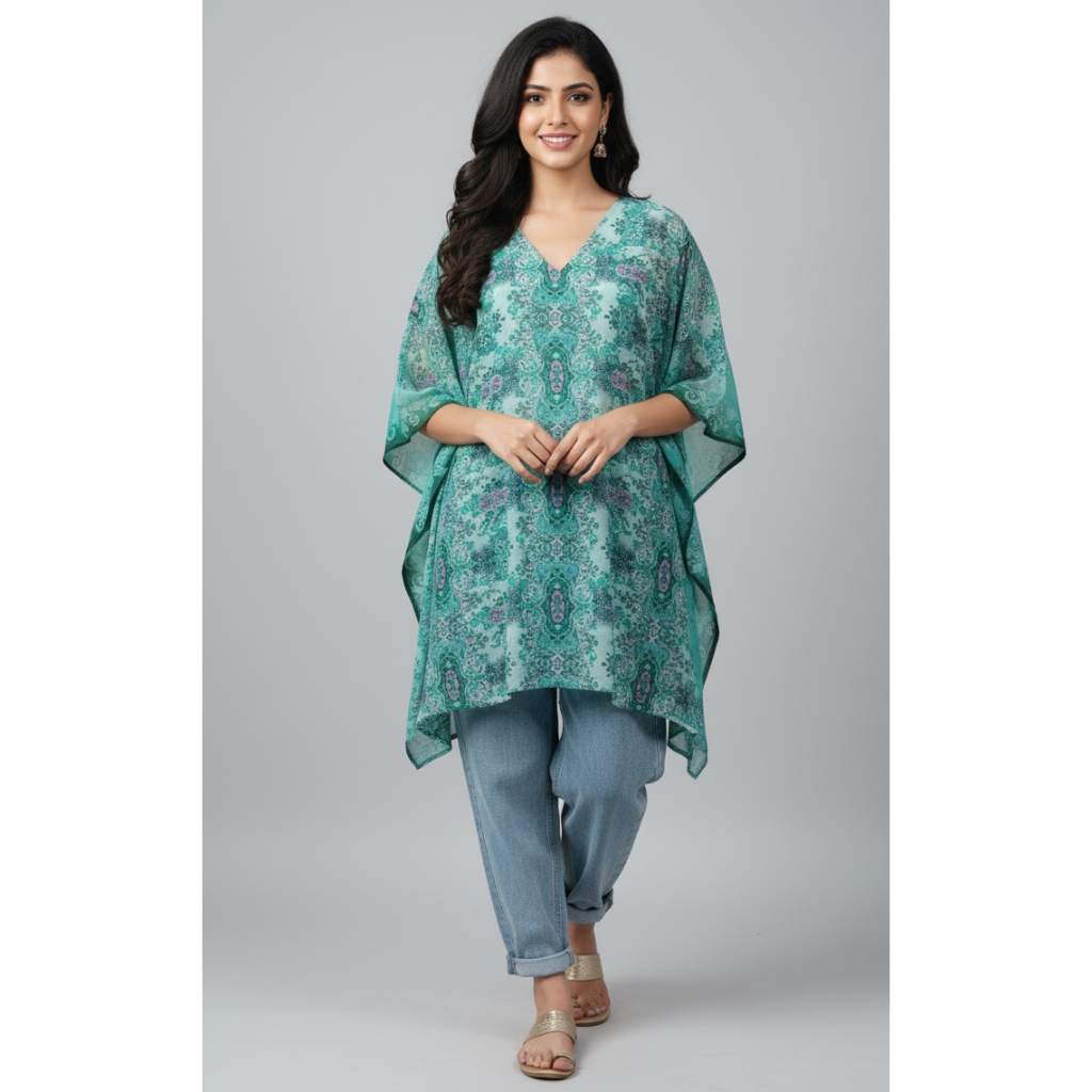 Elegant, breezy, and effortlessly chic — this Green Printed Kaftan from Kuberaa Fashions is a must-have addition to your stylish wardrobe. Crafted in a flowy poncho silhouette with a soft drape, it flatters all body types and keeps you comfortable all day long.