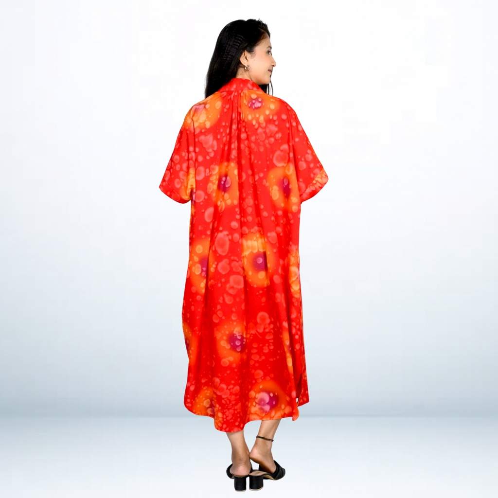 Red Hand Spray Printed Long Kaftan from the Kuberaa Fashions Boutique Exclusive Collection. Crafted from luxurious Soft fabric.