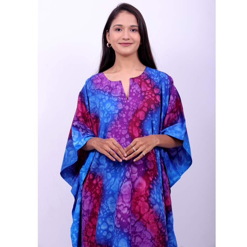 Experience effortless beach elegance with this stunning tie-dye printed long kaftan from Kuberaa Fashions. Designed in an artistic blend of purple, blue, and pink hues, this kaftan is crafted in soft, breathable polyester that drapes beautifully for a flattering silhouette. The relaxed fit and easy neckline make it perfect as both a beach cover-up and a breezy lounge outfit.