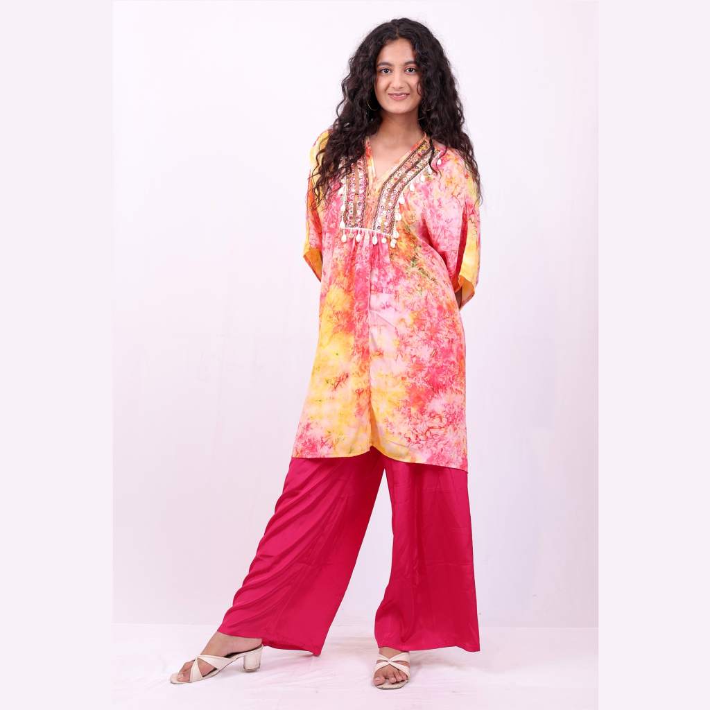 Crafted in premium crepe fabric, the kaftan pairs beautifully with relaxed-fit pants available from M to 3XL, ensuring comfort and elegance for all body types. The V-neckline, flowy drape, and kimono-style sleeves create a silhouette that blends modern ease with festive charm.