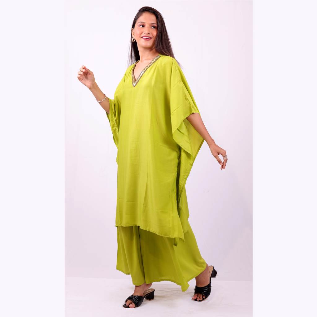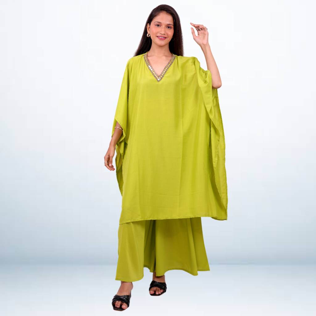 Elegant mirror & beads embellished detailing free size Kaftan with matching pants.