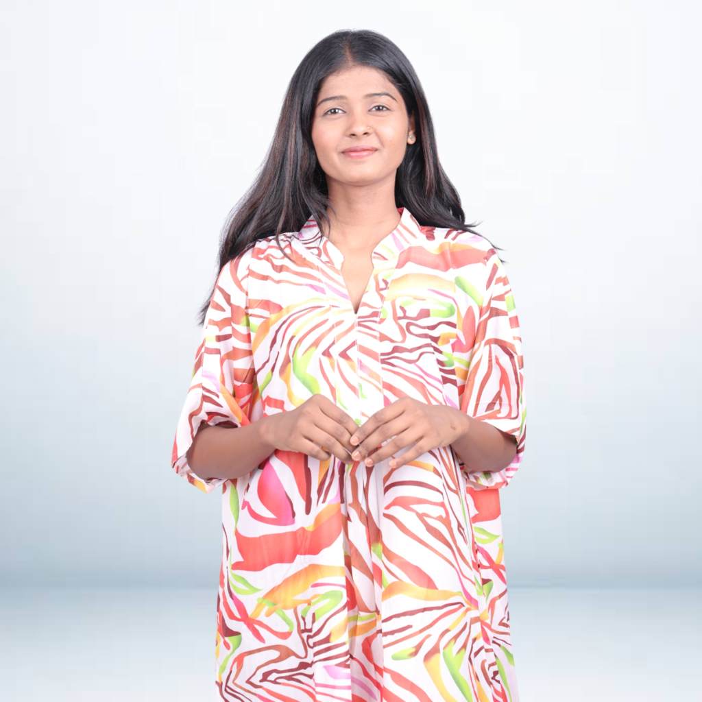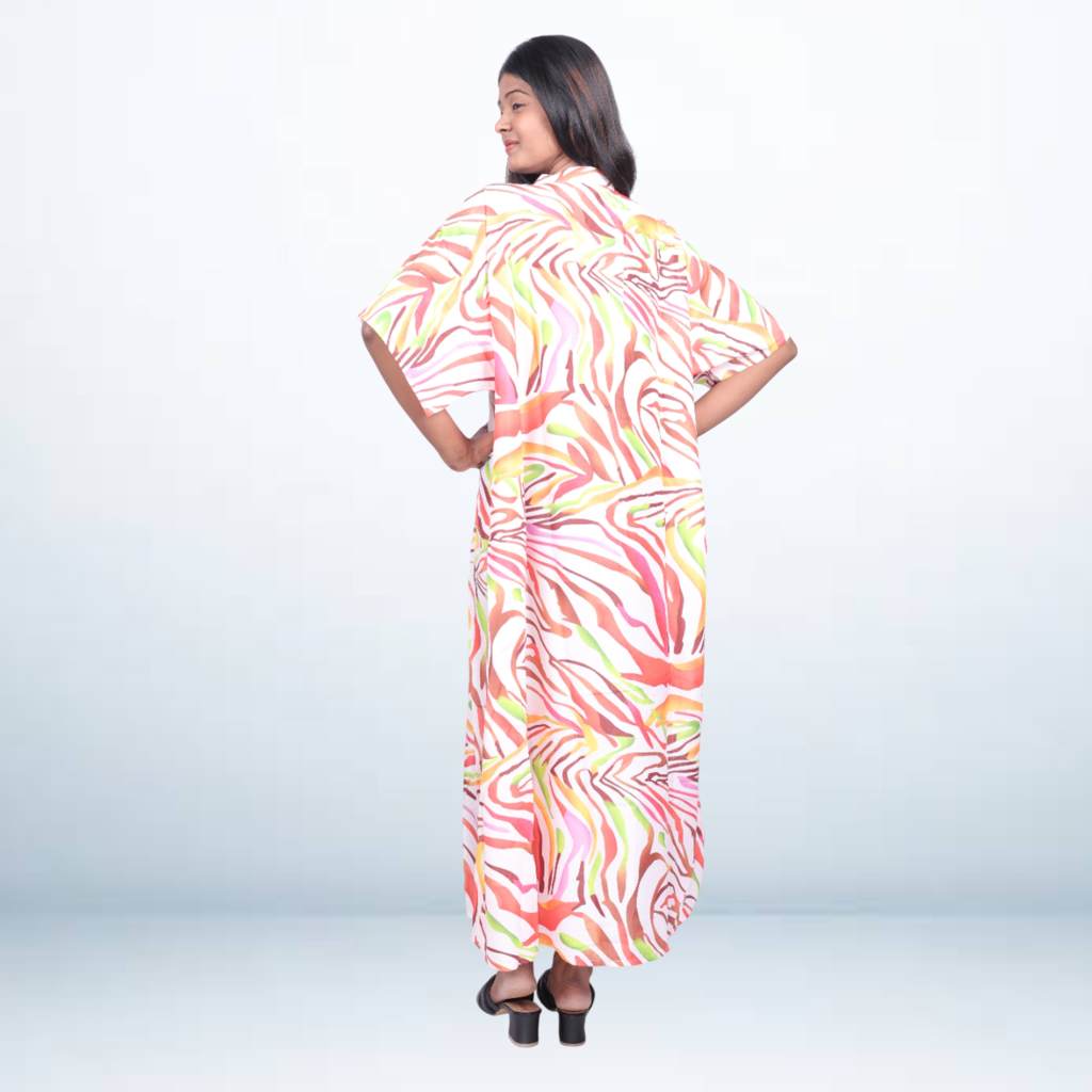 Step into effortless elegance with this multicolor abstract printed long kaftan. Designed with a vibrant mix of red, orange, yellow, and green tones, this free-size kaftan offers both comfort and chic style. Made from lightweight fabric, it features a soft neckline, half sleeves, and a relaxed silhouette that drapes beautifully. Ideal for resort wear, lounging, or casual outings, this kaftan brings a lively touch to your everyday wardrobe.