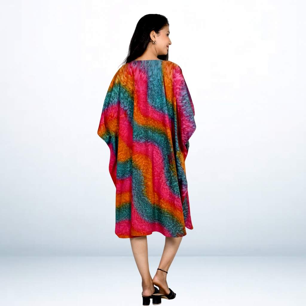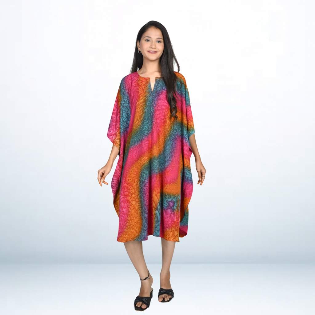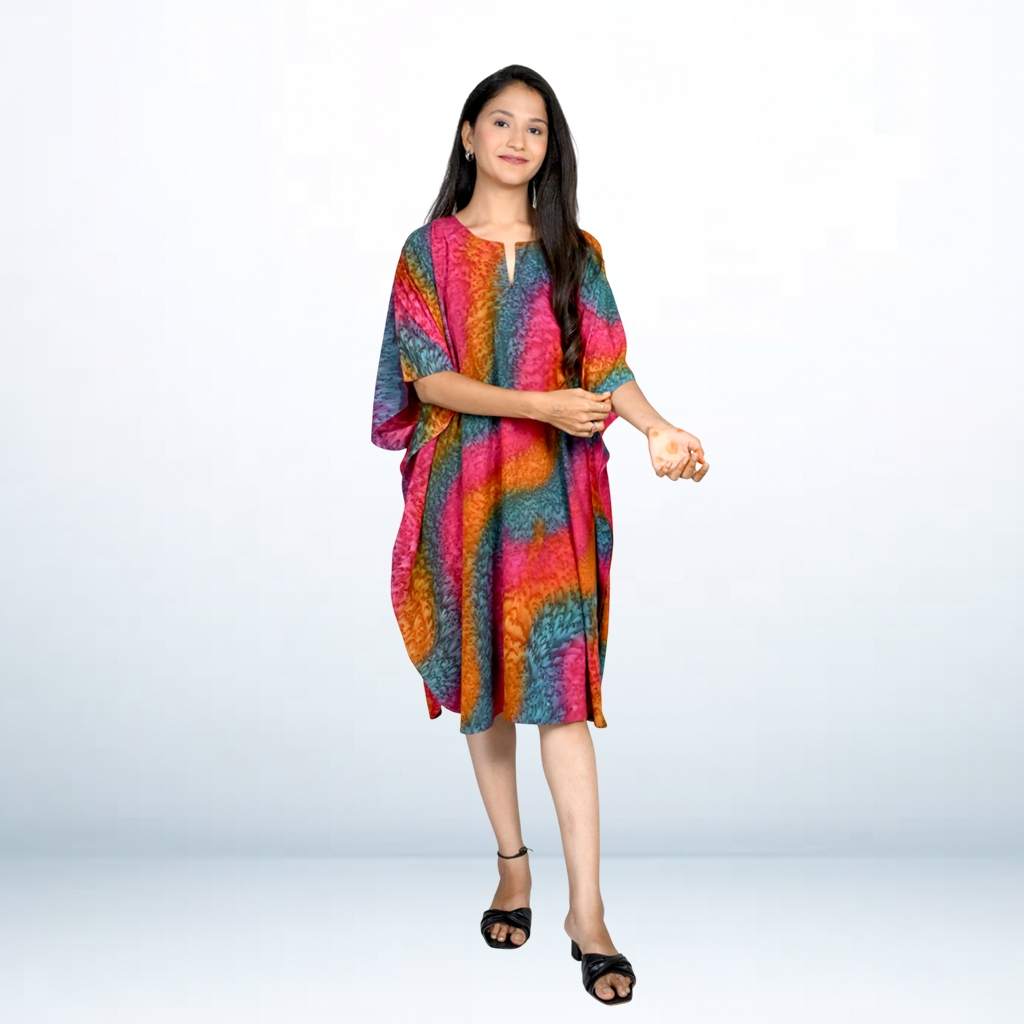 Step into effortless style with the Tie Dye Splash Kaftan from Kuberaa Fashions. This striking piece features a vibrant burst of tie-dye patterns on soft, breathable polyester fabric, offering both comfort and flair. Designed in a free size to fit most body types (M to 5XL), the relaxed silhouette drapes beautifully with its V-neckline and kimono-style sleeves. Perfect as a beach cover-up, casual daywear, or lounge tunic, this kaftan adds a playful splash of color to your wardrobe. Pair it with leggings, palazzos, or shorts for versatile styling.