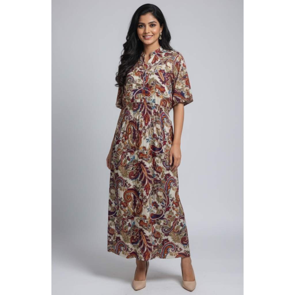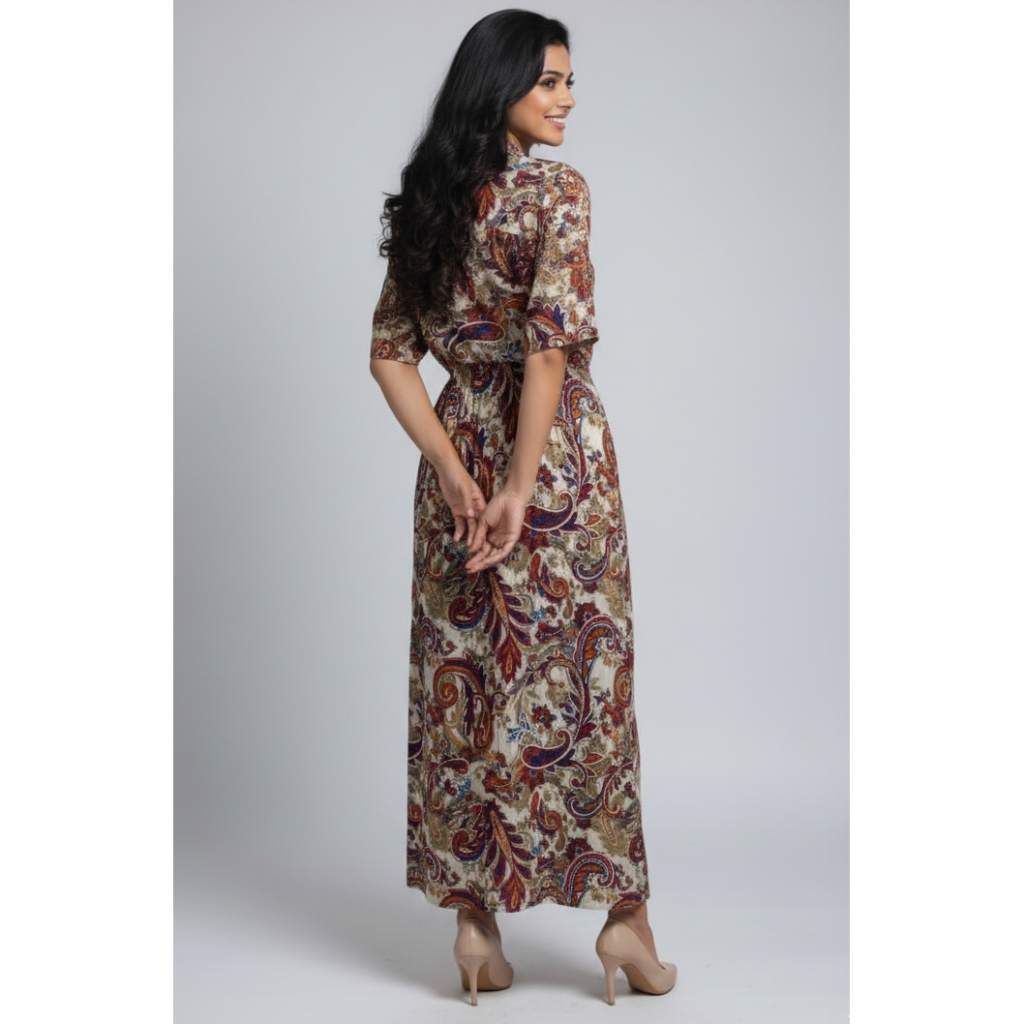 Elegant, traditional, and timeless — this Multicolor Paisley Printed Long Dress from Kuberaa Fashions brings classic charm to your everyday wardrobe. Featuring rich paisley motifs in earthy tones of maroon, blue, green, and mustard, this dress offers a beautifully detailed look. The soft fabric, half sleeves, and front button detailing add a touch of comfort and sophistication, making it perfect for casual and semi-ethnic outings.
