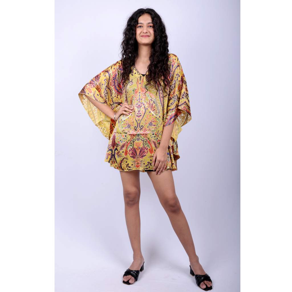Crafted from breathable polyester fabric, this free-size tunic flatters a wide range of body types with its relaxed silhouette and kimono-style sleeves. Whether you're lounging, vacationing, or heading out for a casual day, this kaftan offers unmatched versatility. Style it over jeans, palazzos, or leggings—it transitions seamlessly from daywear to resort chic.