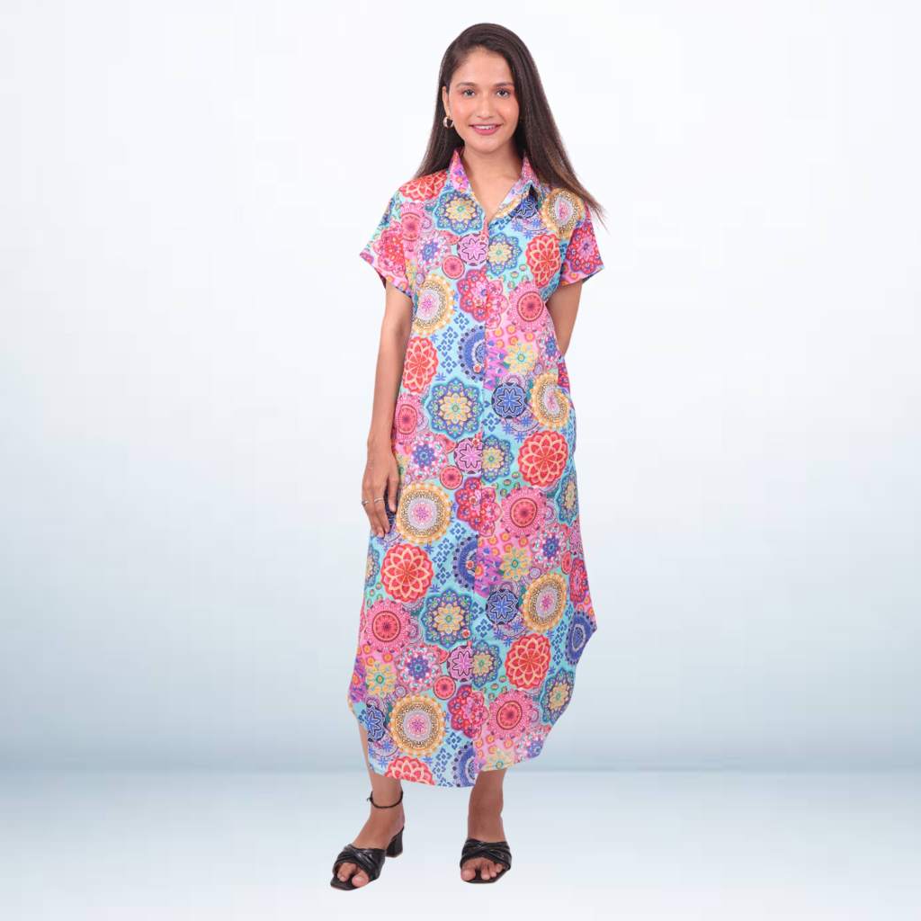 Bring a splash of color and comfort to your wardrobe with our Paisley Printed Dress from the Kuberaa Fashions Boutique Exclusive Collection. Crafted in soft, breathable viscose fabric, this shirt-style dress features a medley of vibrant paisley motifs with a mandala touch — perfect for brunches, summer strolls, and holiday escapes.