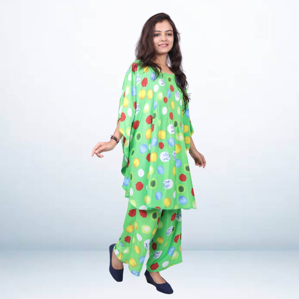 Step into effortless elegance with the Abstract Allure Co-ord Set from Kuberaa Fashions' Boutique Exclusive Collection. Featuring a vivid and contemporary abstract print, this matching top and pant set is crafted from premium polyester for a soft, breathable, and wrinkle-resistant finish. The relaxed yet flattering silhouette makes it a go-to choice for brunches, vacations, and all-day comfort wear. Available in sizes S to 3XL, this co-ord set offers a polished look while celebrating freedom of movement and style. Dress it up with heels or go casual with flats—either way, it's a wardrobe must-have for modern women who love standout prints.