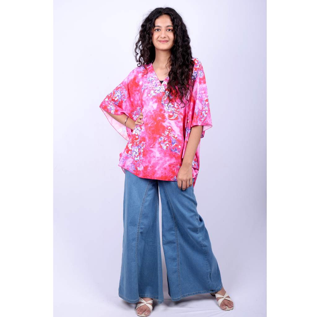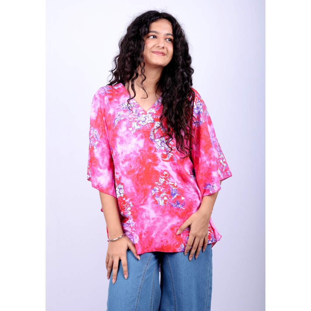 Add a burst of color and charm to your wardrobe with this Pink Tie-Dye Short Kaftan from the Kuberaa Fashions Boutique Exclusive Collection. Made from premium polyester fabric, this kaftan features a delicate floral tie-dye design in soft pink tones. The V-neckline and flowing kimono sleeves enhance its relaxed silhouette, perfect for lounging, layering, or casual day-outs.