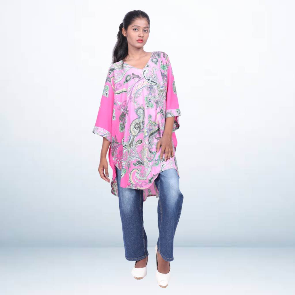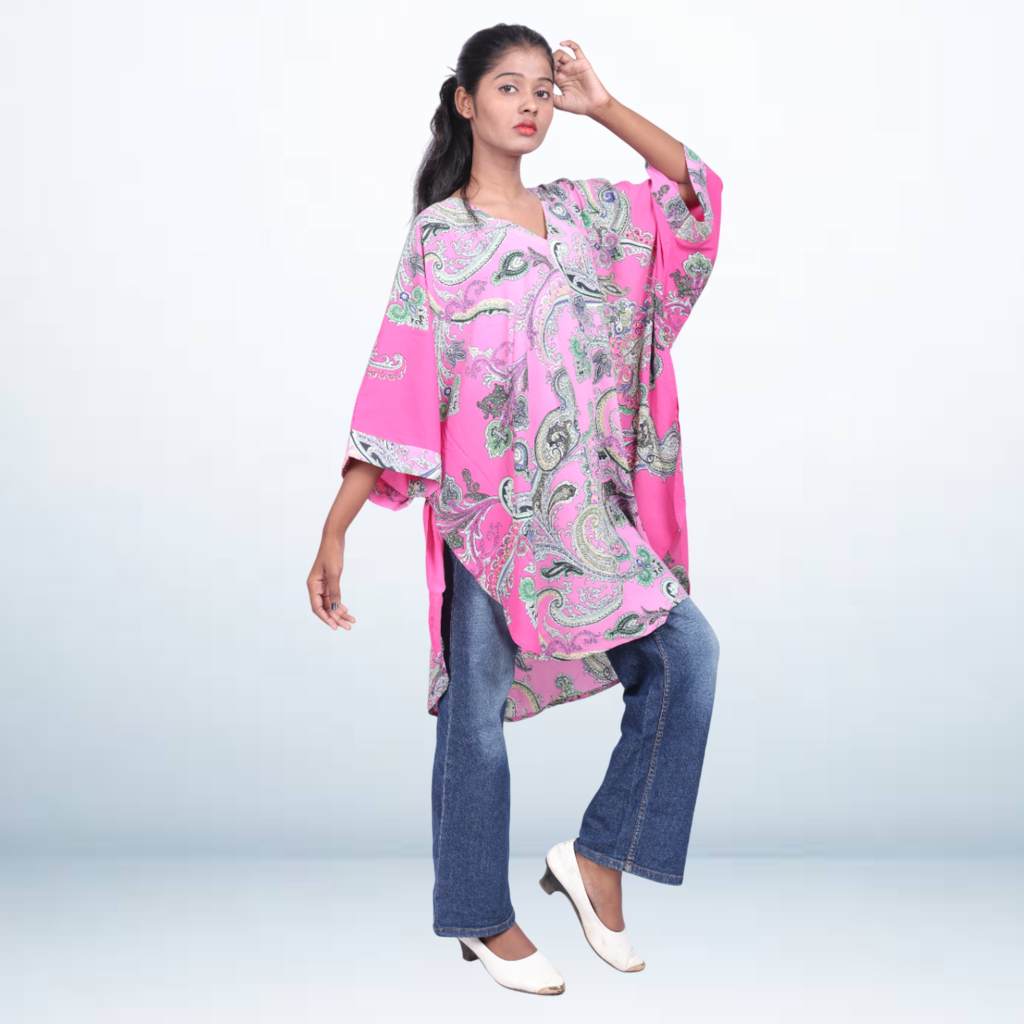 Add a splash of color to your casual wardrobe with this pink paisley print short kaftan cover-up. Designed in a flowy free-size silhouette, it features a vibrant paisley design that brings a touch of bohemian charm. The lightweight fabric ensures comfort, making it perfect for layering over jeans, shorts, or as a beach cover-up.