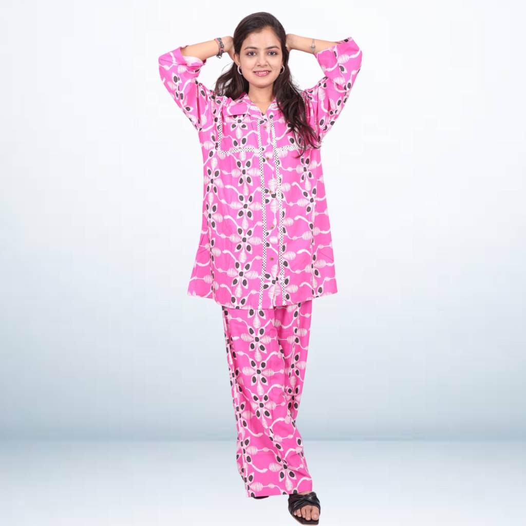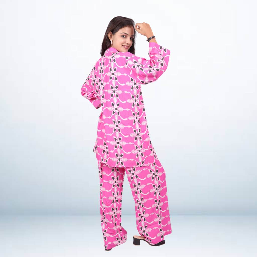 Brighten up your wardrobe with this Pink Printed Shirt Pant Set, crafted for comfort and style. The kaftan top features a collared neckline with button-down detailing, offering a modern twist to the classic design. Paired with relaxed-fit matching pants, the outfit ensures easy wear and effortless elegance. The bold floral-inspired print adds a lively touch, making it perfect for casual outings, lounge wear, or festive moments.