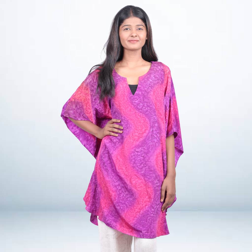 Add a pop of color to your wardrobe with this pink and purple abstract print short kaftan cover-up. Crafted from lightweight fabric for all-day comfort, this kaftan features a soft flowy drape and a flattering V-neckline. The wavy abstract design brings a fresh, modern touch — perfect for beach days, lounging, or casual outings. Pair it with jeans, shorts, or wear it over your swimwear for an effortless cover-up look.