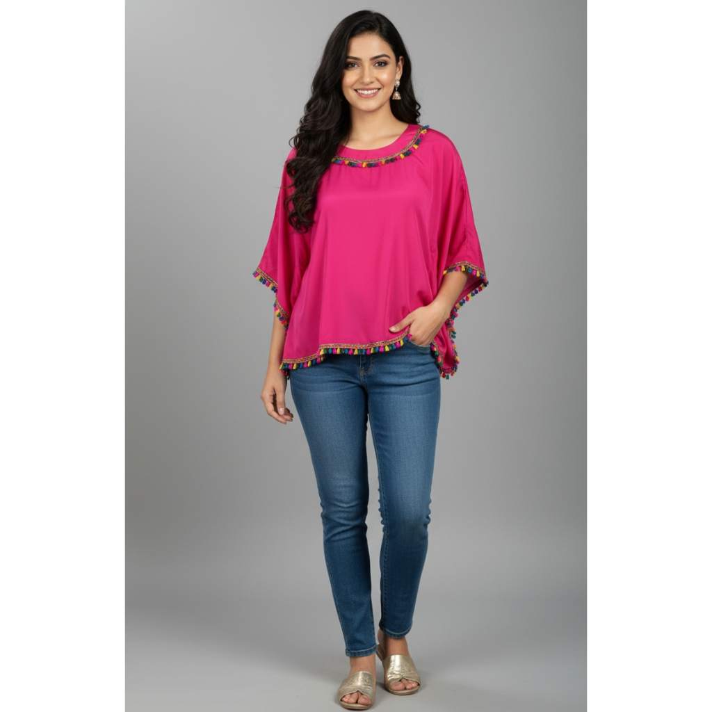 Bright, chic, and effortlessly stylish — this Pink Tassel Trim Poncho Top from Kuberaa Fashions is designed to bring a playful pop of color to your everyday wardrobe. Made from soft, flowy polyester fabric, it drapes beautifully on all body types and offers maximum comfort for all-day wear.