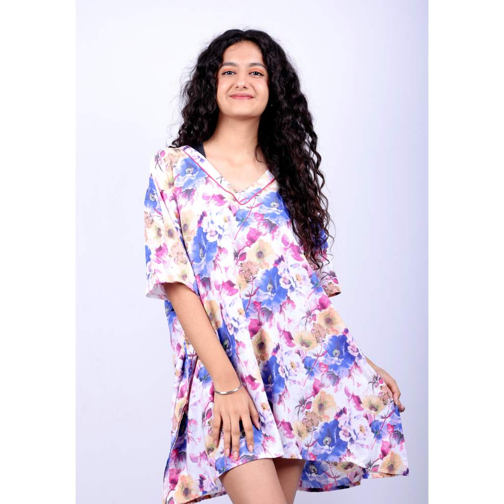 Celebrate effortless elegance with the Pretty Floral Short Kaftan Tunic from Kuberaa Fashions – Boutique Exclusive Collection. Crafted from soft, breathable polyester fabric, this kaftan is adorned with a vibrant multicolor floral print that exudes femininity and freshness. The free-size silhouette and relaxed fit with kimono-style sleeves make it a versatile addition to your wardrobe – whether you wear it as a breezy top, a beach cover-up, or pair it with your favorite bottoms for casual outings.