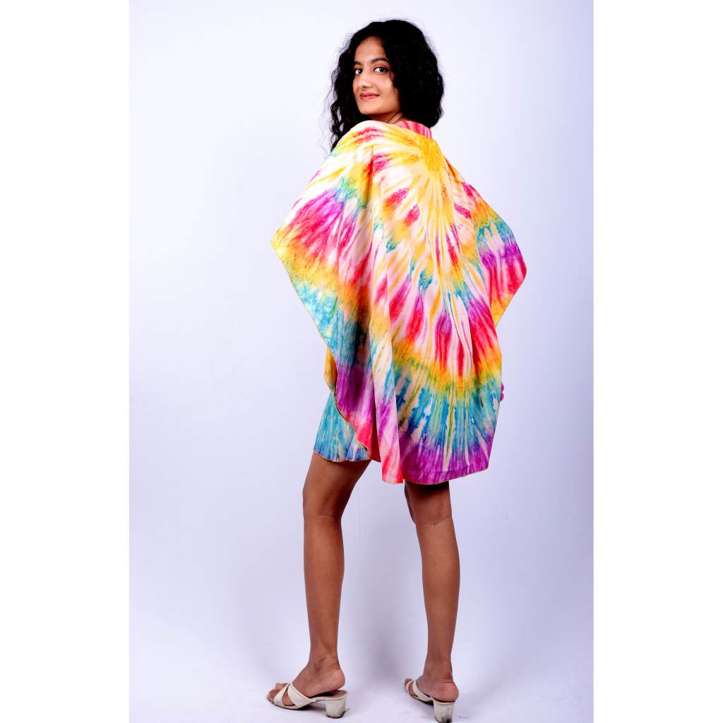 Make a bold fashion statement with the Rainbow Spiral Tie-Dye Kaftan Tunic from Kuberaa Fashions – a boutique exclusive crafted for color lovers. Featuring a vibrant spiral of rainbow hues, this kaftan blends traditional tie-dye with a contemporary silhouette. Made from lightweight polyester, it offers all-day comfort with a flattering V-neckline and flowing kimono sleeves. The free size design fits beautifully from M to 5XL, making it a versatile choice for women of all shapes.