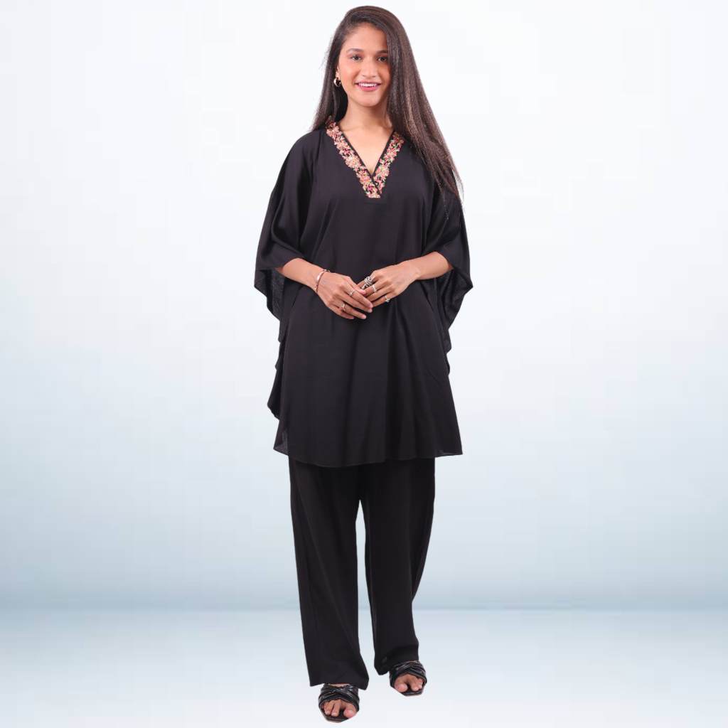 Step into effortless grace with this Rayon Kaftan with Pant Set from Kuberaa Fashions' boutique exclusive collection. Made from breathable rayon fabric, the kaftan features a relaxed silhouette enhanced by delicate embroidery work on the neckline. The straight-fit pant adds structure while keeping the overall look flowy and comfortable. Ideal for festive gatherings, casual celebrations, or elegant daywear styling.