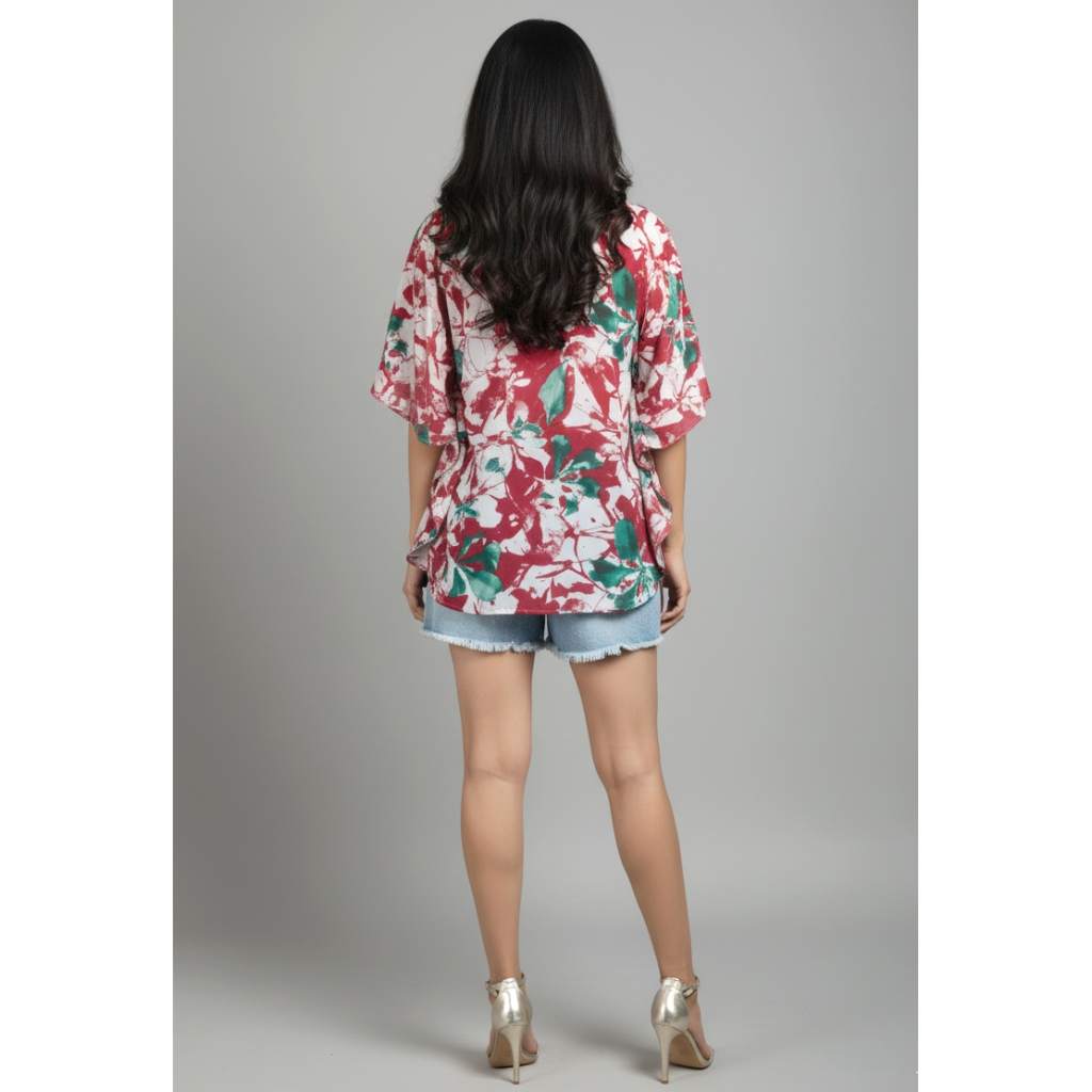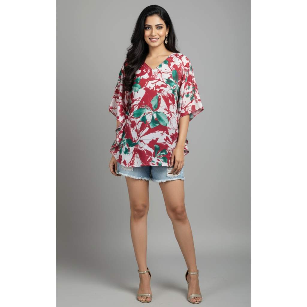 Bright, refreshing, and effortlessly chic — this Red & Green Floral Short Kaftan Tunic from Kuberaa Fashions brings a stylish tropical flair to your everyday wardrobe. Designed in a free-flowing kaftan silhouette, it offers a relaxed fit that flatters all body types up to 44" bust (XXL).