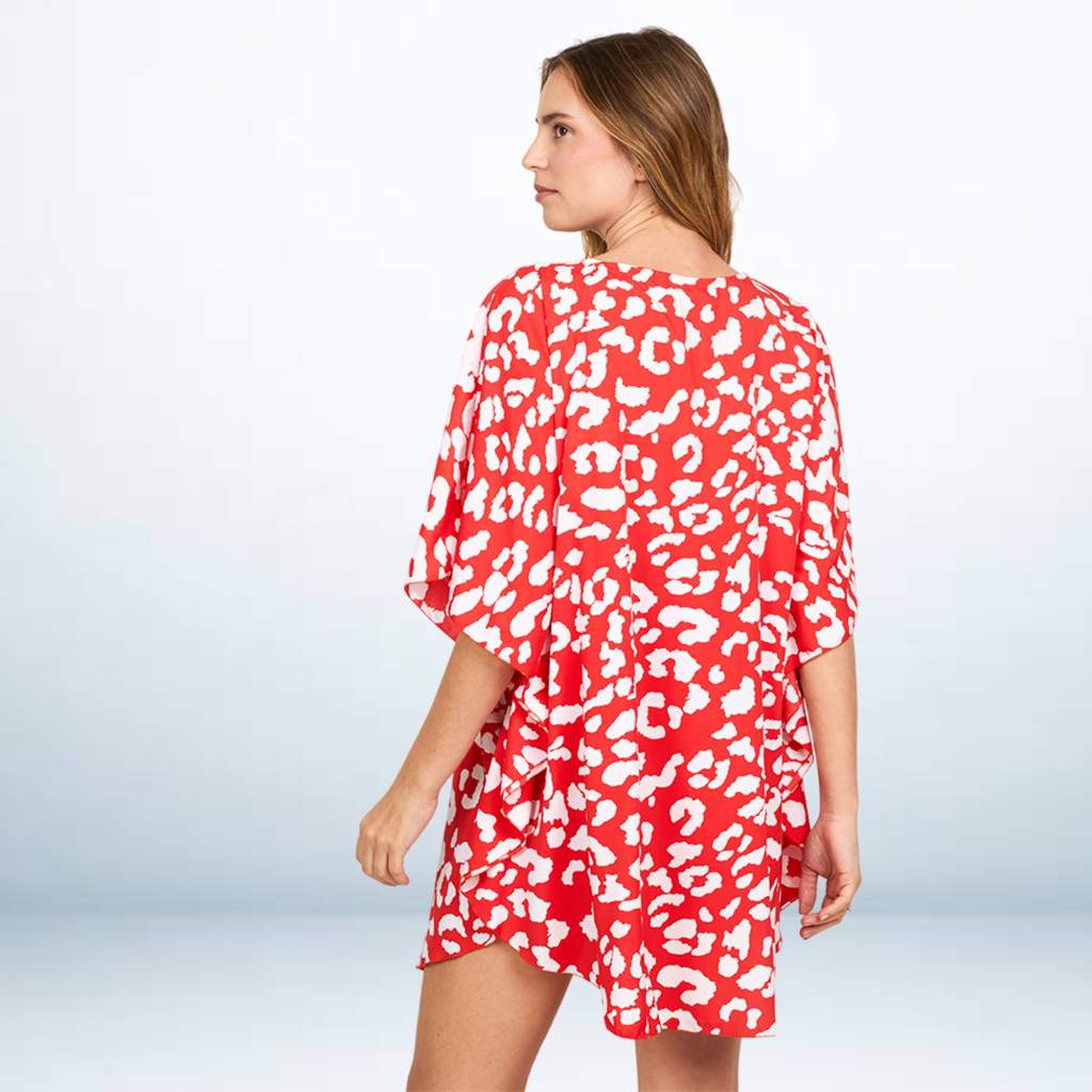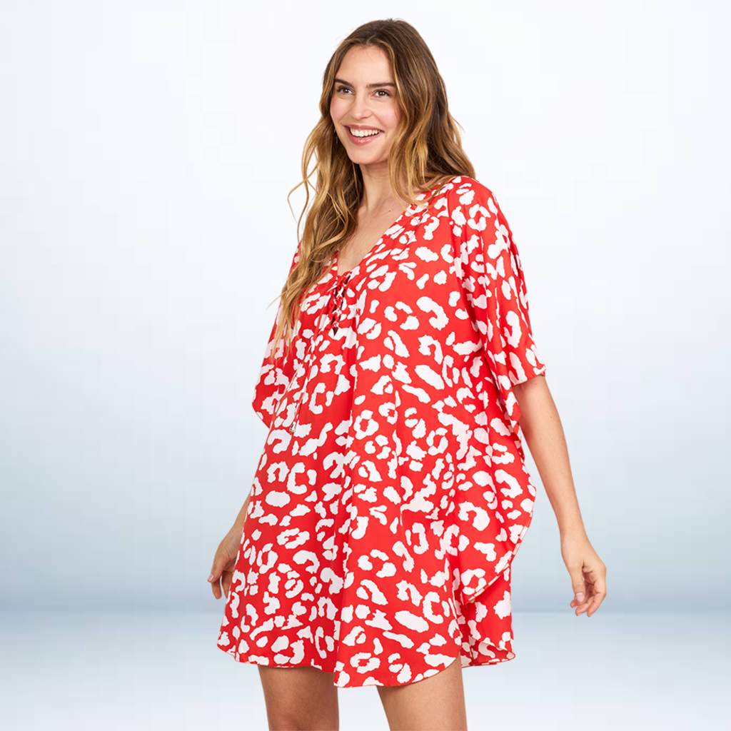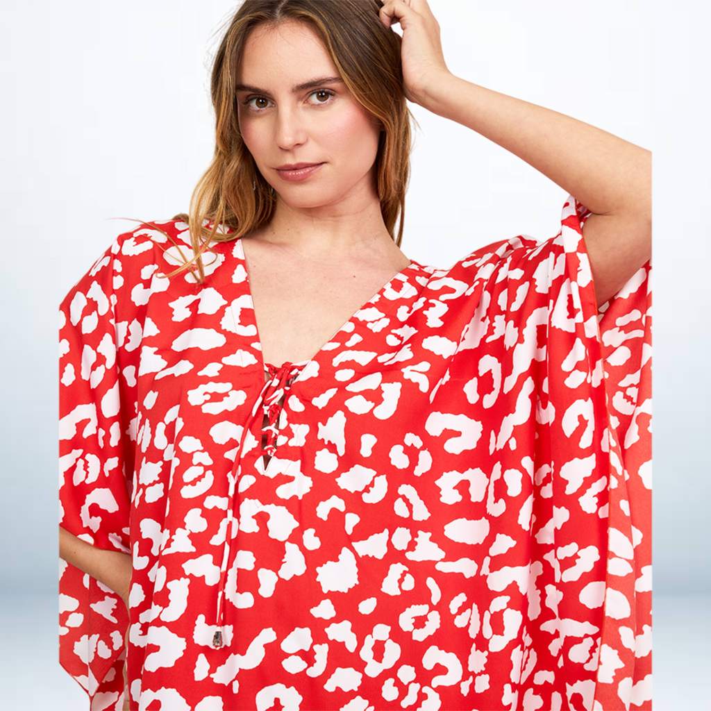 The kaftan is styled in a striking red and white print, resembling a bold, abstract leopard or cheetah spot pattern. The primary color is a vivid scarlet red, with the spots rendered in white.
