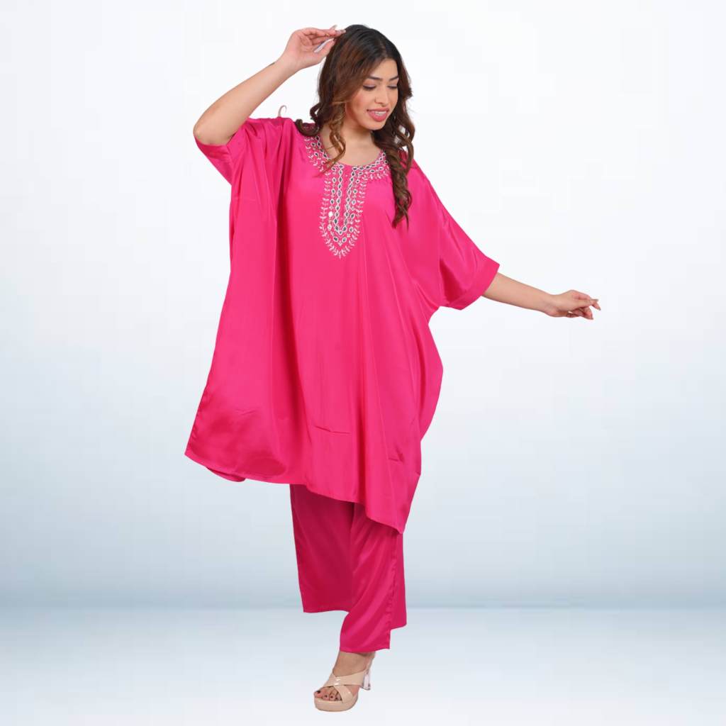 Add a touch of elegance and grace to your wardrobe with our Rose Embellished Kaftan Pant Set from the Boutique Exclusive Collection at Kuberaa Fashions. Crafted from premium crepe fabric, this two-piece ensemble features a luxuriously flowy free-size kaftan adorned with intricate embellishments on the neckline for a refined finish. The coordinated pants (available in sizes M to 3XL) offer a comfortable and flattering fit, making this set perfect for festive gatherings, evening soirées, or stylish resort getaways.