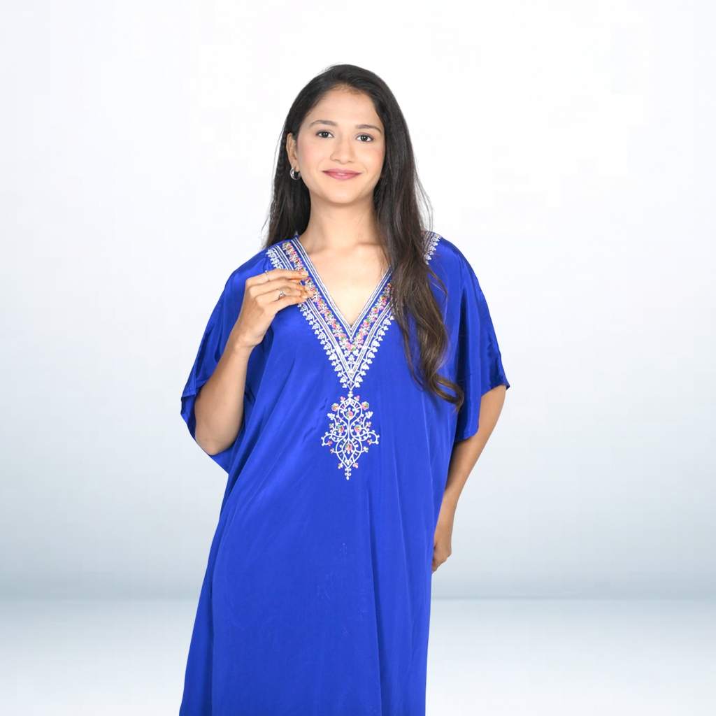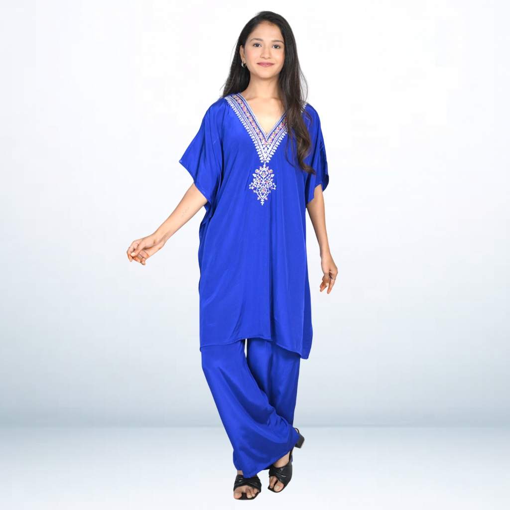 Step into elegance with the Embroidered Kaftan Pant Set from Kuberaa Fashions’ Boutique Exclusive Collection. This stunning two-piece ensemble includes a flowy free-size kaftan and coordinated pants available in sizes M to 3XL, making it the perfect choice for women who appreciate style with comfort.