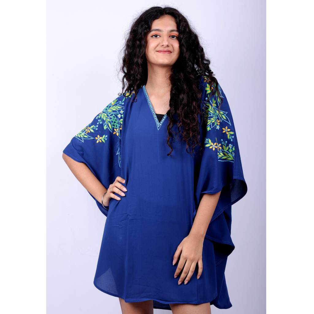Add a vibrant floral statement to your wardrobe with the Sapphire Bloom Kaftan Tunic from Kuberaa Fashions. Crafted in soft, breathable polyester fabric, this free-size kaftan offers comfort and elegance for all body shapes. The rich sapphire blue base is beautifully adorned with blooming floral prints, making it a stunning option for daytime outings, resort wear, or relaxed evenings. Featuring a flattering V-neckline, kimono-style sleeves, and relaxed draping, this tunic combines fashion and function effortlessly.