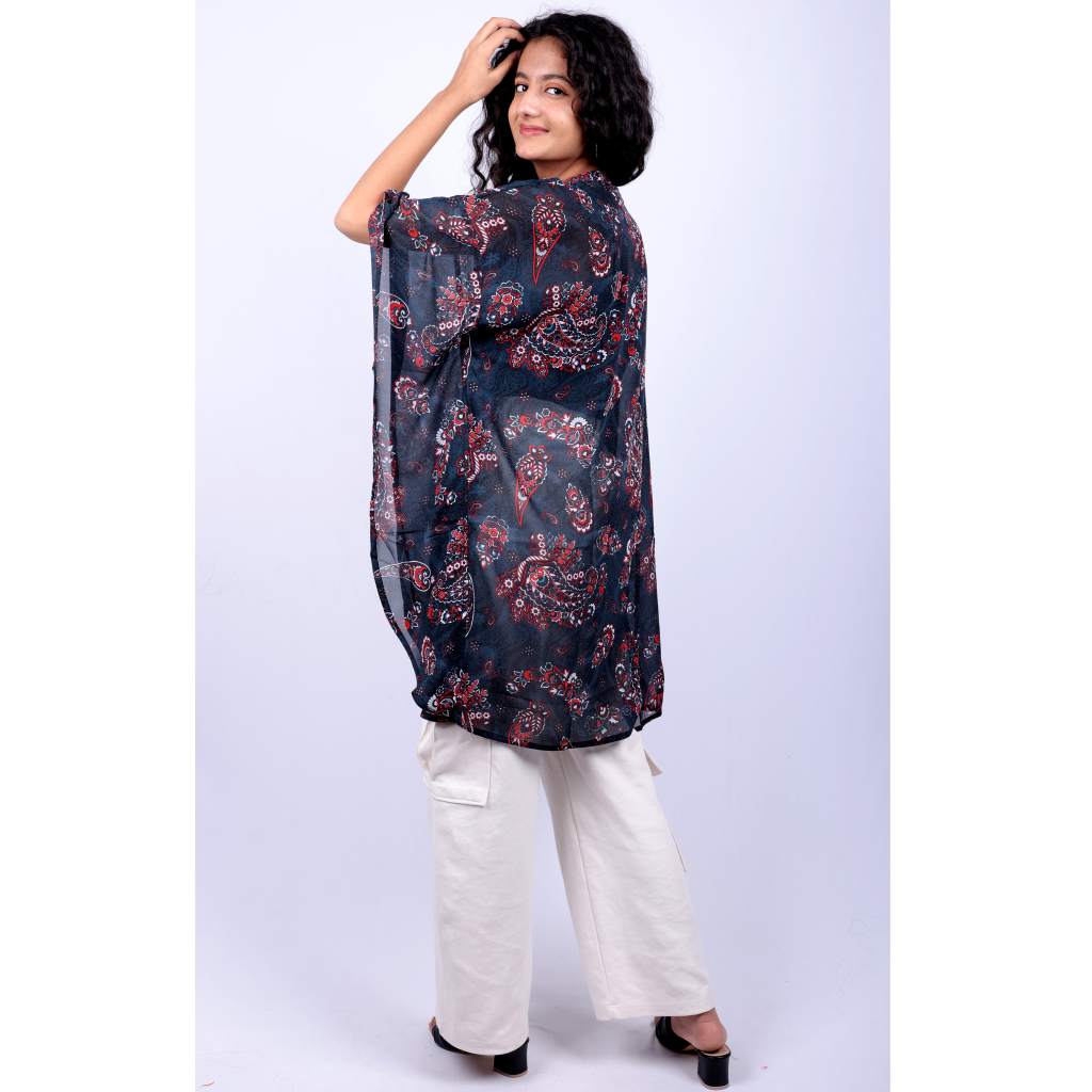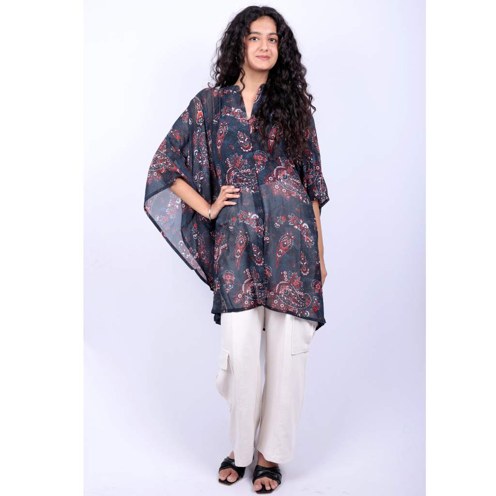 Step into effortless elegance with the Sheer Paisley Printed Kaftan Tunic from Kuberaa Fashions’ boutique exclusive collection. Made from airy, lightweight