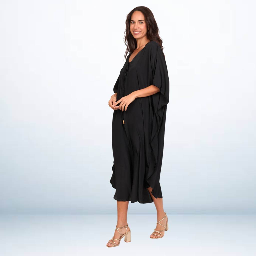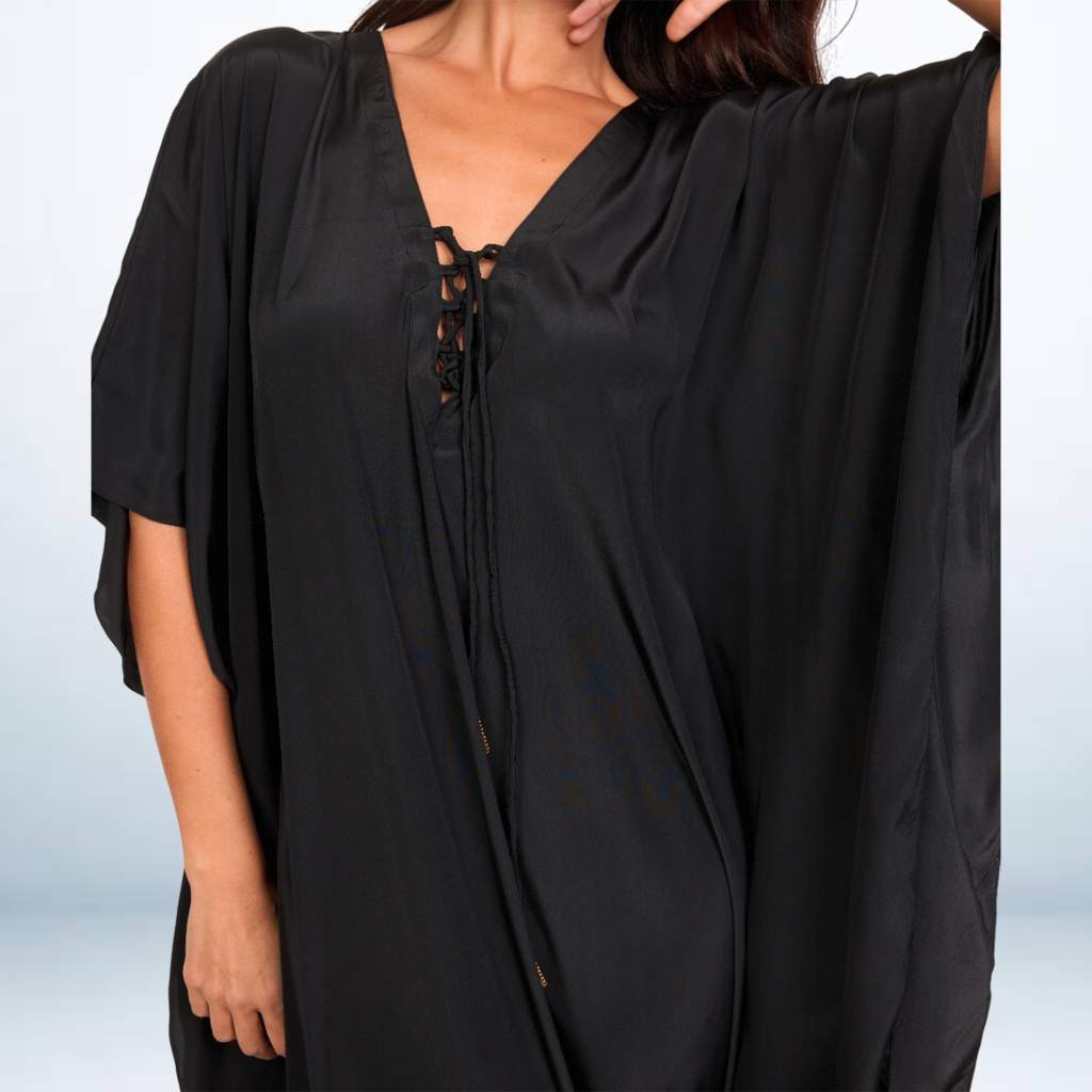 A vibrant, full-length studio shot featuring a confident woman modeling a flowing, relaxed-fit kaftan dress in a striking magenta hue. The kaftan is characterized by its dramatic, voluminous silhouette, which drapes elegantly from the shoulders. A key design element is the deep V-neckline, which features an adjustable lace-up placket with color-matched ties and elegant gold aglets. The dress has wide, batwing-style sleeves and hits at a versatile midi length. The look is elevated with slender, strappy gold heeled sandals.