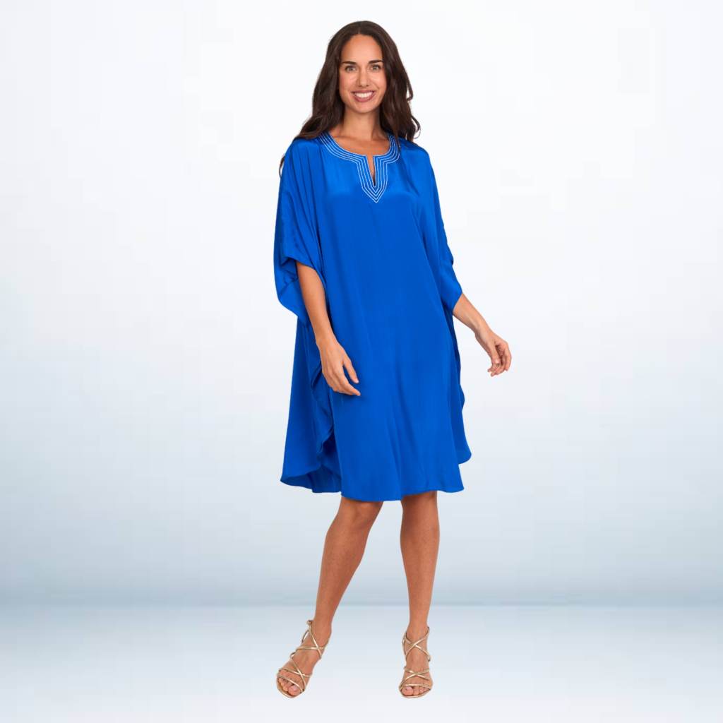A model showcases a chic, relaxed short kaftan dress in a brilliant, vivid cobalt blue hue. This effortless garment features a loose, flowing silhouette that hits above the knee, making it an ideal choice for resort or warm-weather styling.