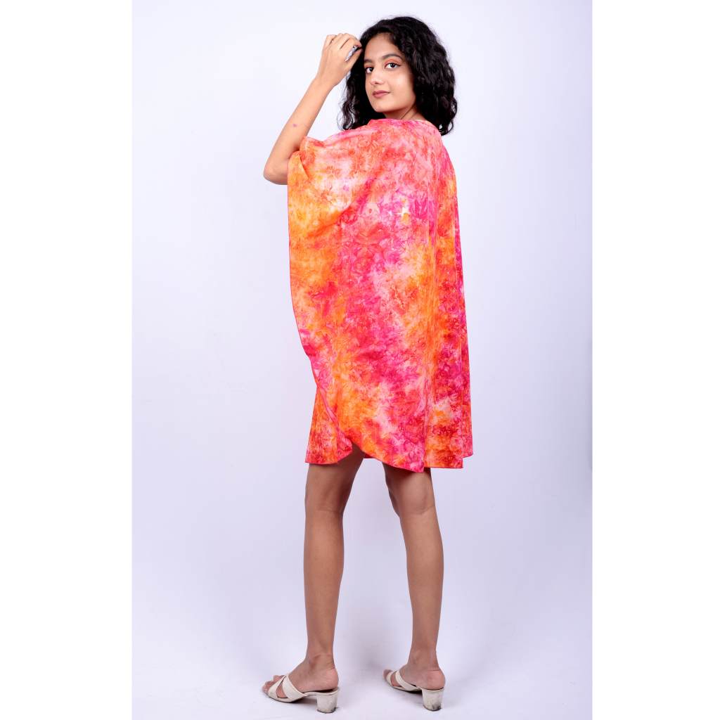 Add a burst of tropical energy to your wardrobe with the Sunset Burst Tie-Dye Kaftan Tunic from Kuberaa Fashions. Designed for effortless comfort and vivid style, this printed kaftan features radiant tones of pink, orange, and magenta – reminiscent of a glowing sunset sky.