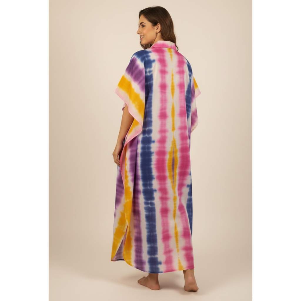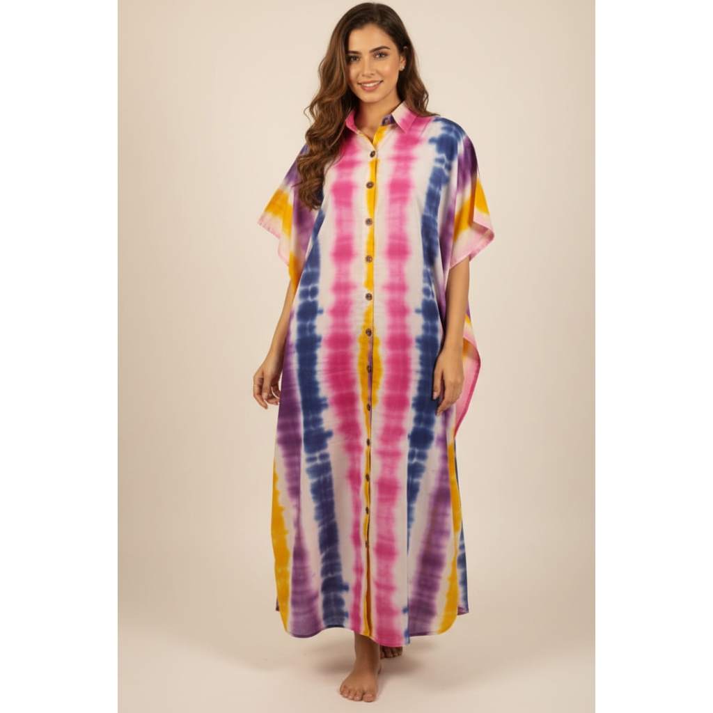 This vibrant long kaftan features a stunning multi-color tie-dye pattern with a full button-down front and a comfortable collar neck. Made from soft, breathable cotton, it is perfect for daily wear, lounging, vacations, and resort looks. The relaxed silhouette provides effortless comfort and fits beautifully up to 52" bust (4XL).